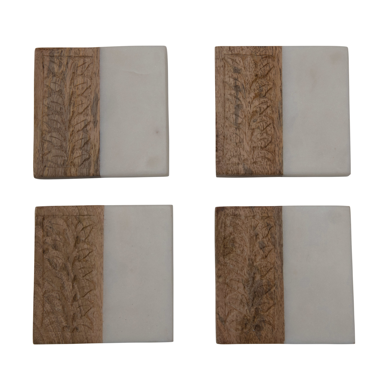 Catalog Name: 4" Square Hand-Carved Mango Wood & Marble Coasters w/ Engraved Design, White & Natural, Set of 4