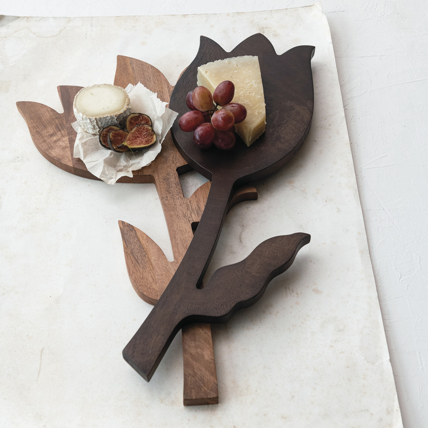 This Mango Wood Flower Shaped Serving Board is a masterpiece that combines form and function. Its floral silhouette and the warm tones of natural mango wood make it a standout piece for any gathering. Measures 20 inches in length and 12 inches in width, offering a generous area for display and function. Whether used for slicing artisanal breads, presenting a selection of fine cheeses, or simply as a decorative element, this board brings a touch of nature's beauty to the table. It's a serving board that's as practical as it is picturesque, embodying the heart of farmhouse, French country, and eclectic styles.