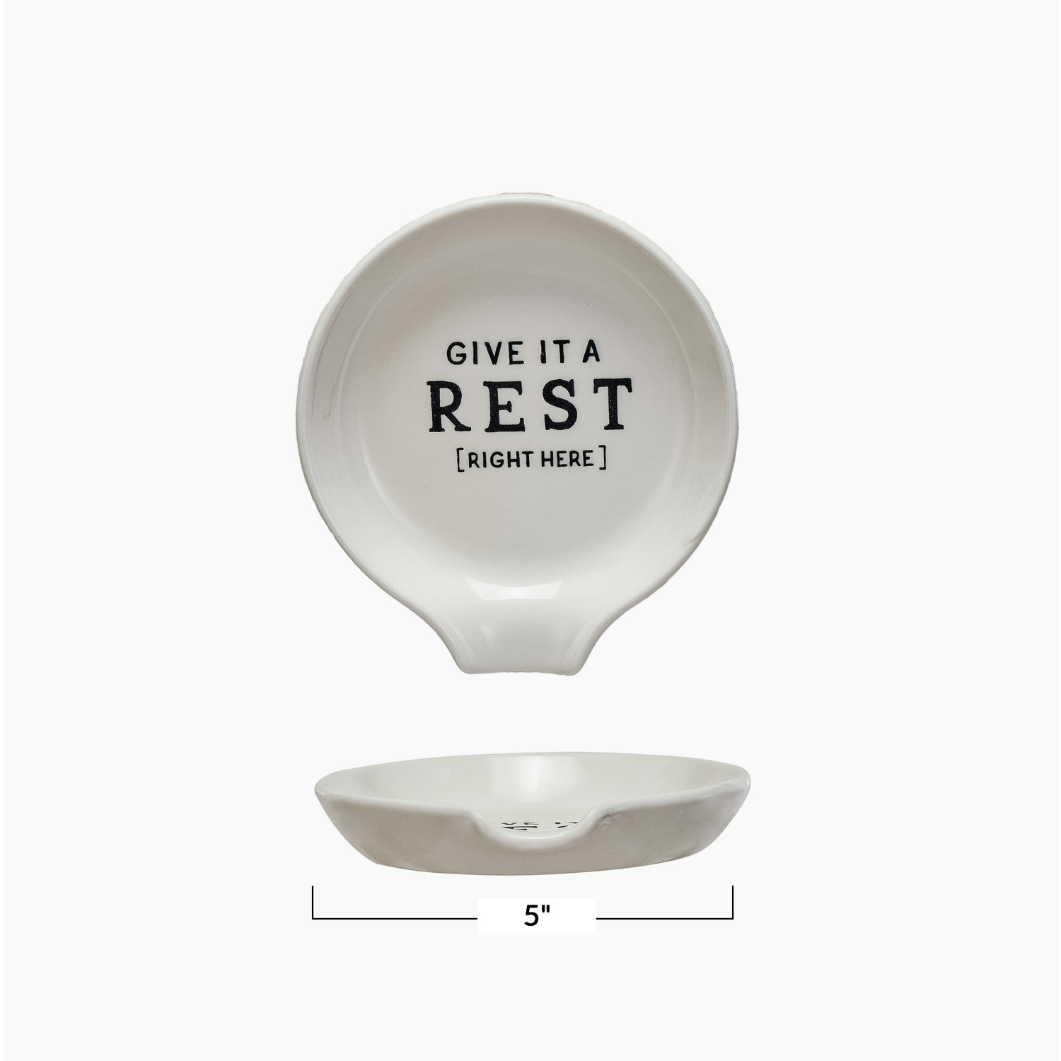 Catalog Name: 5"L x 4-1/2"W Stoneware Spoon Rest w/ Wax Relief Saying "Give It A Rest", White & Black ©