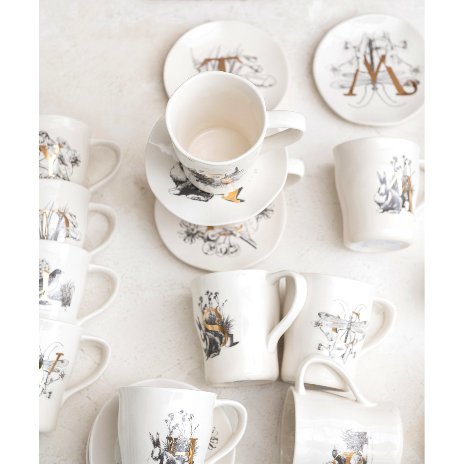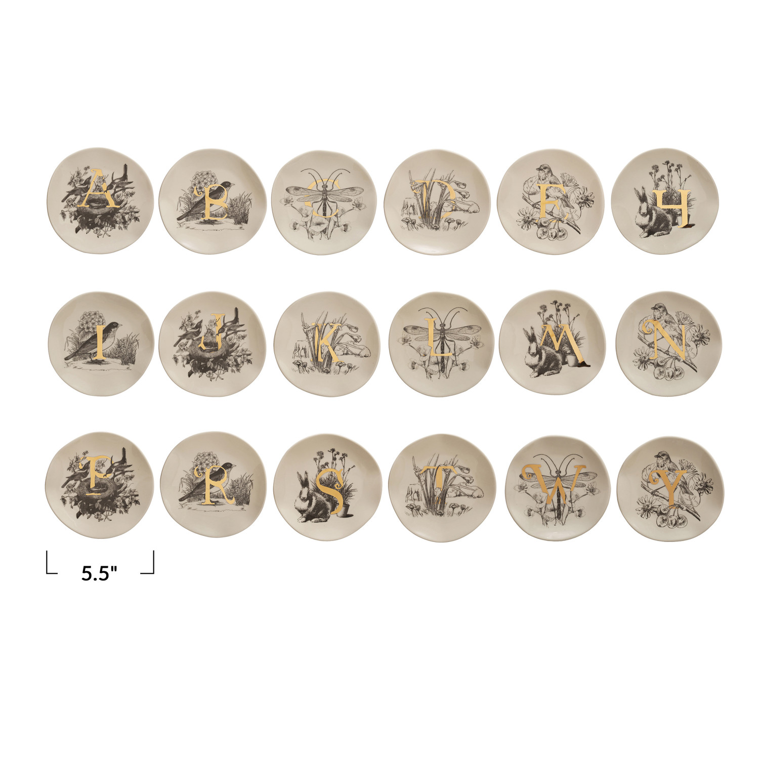 Catalog Name: 5-1/2" Round Stoneware Monogram Plate w/ Flora/Fauna Image & Gold Electroplating, White & Charcoal Color, 18 Styles (Assortment Includes All Letters Except O, F, G, Q, U, V, X & Z)