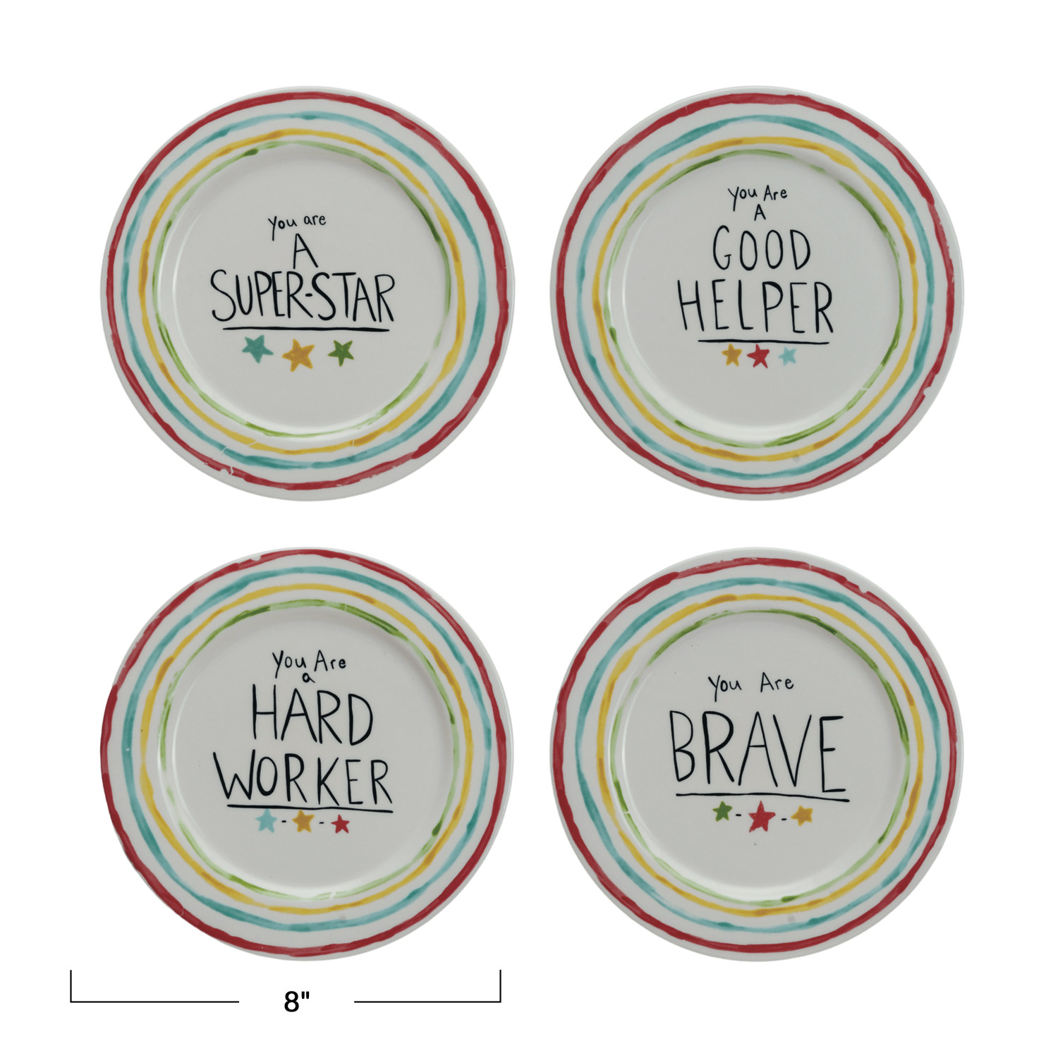 Catalog Name: 8" Round Stoneware Celebration Plate w/ Stars & Striped Edge, Multi Color, 4 Styles ©