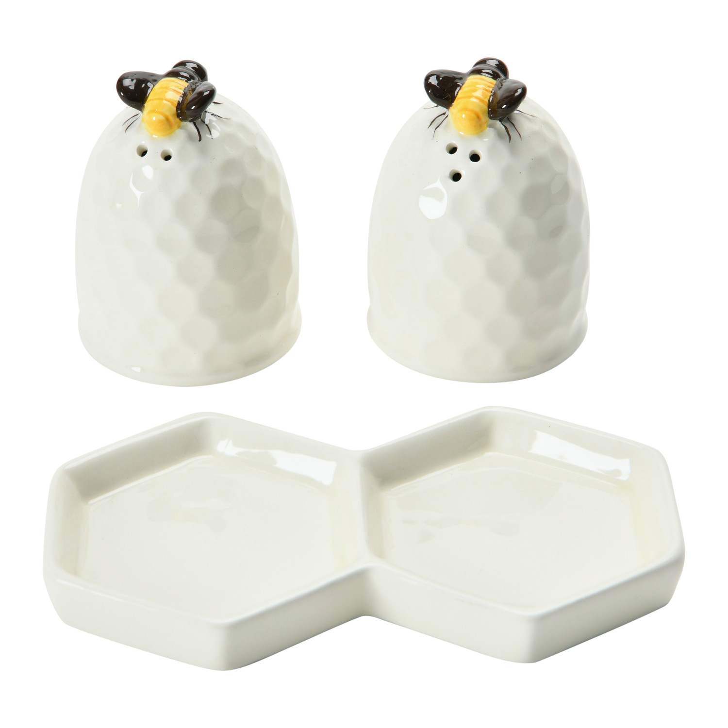 Catalog Name: 6"L Ceramic Vintage Reproduction Beehive Salt & Pepper Shakers w/ Honeycomb Plate, Set of 3