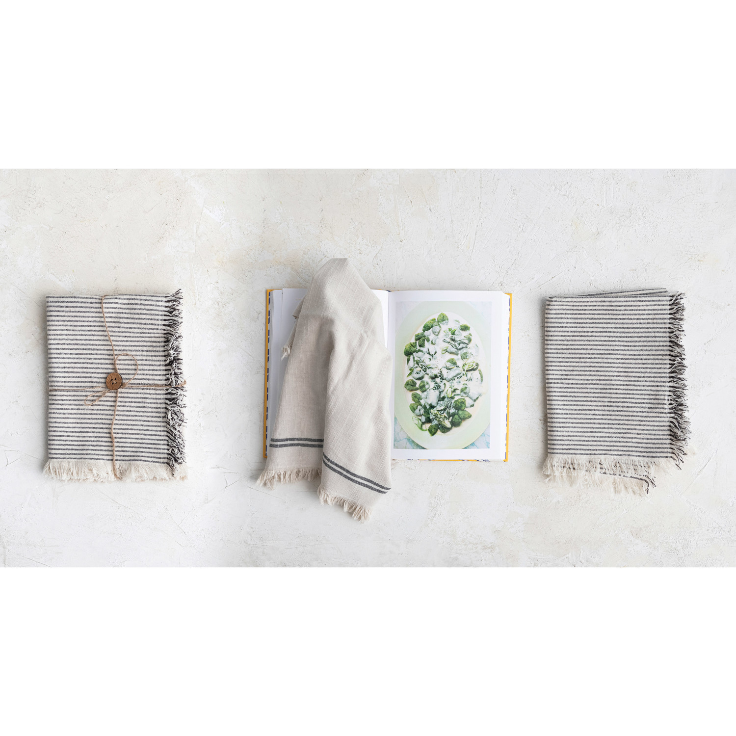 Catalog Name: 28"L x 18"W Woven Cotton Tea Towels w/ Stripes & Fringe, Natural & Black, Set of 2 Tied w/ Jute & Wood Button