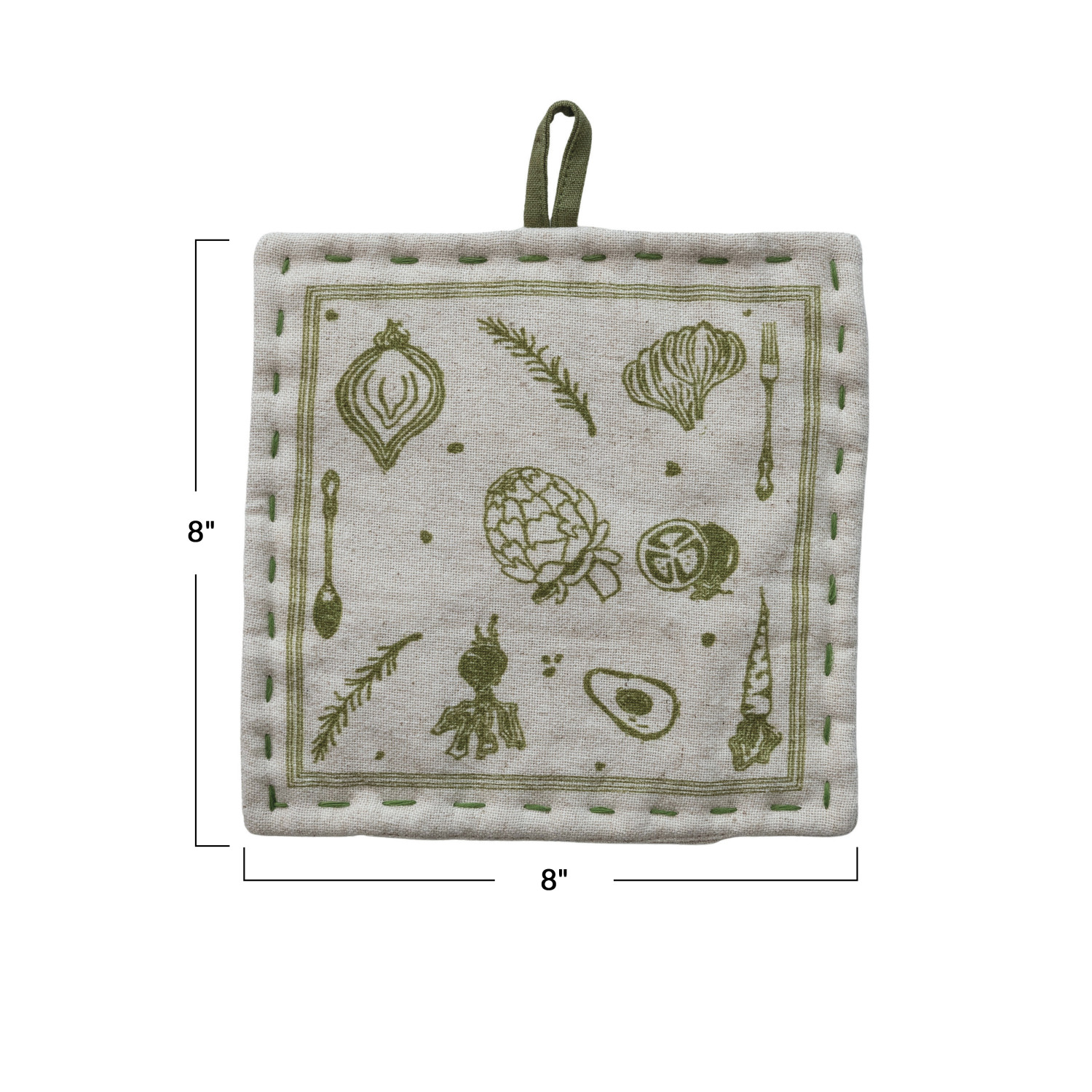 Catalog Name: 8" Square Cotton & Linen Printed Pot Holder w/ Vegetable/Cutlery Pattern & Hand-Embroidered Kantha Stitch, Natural & Green