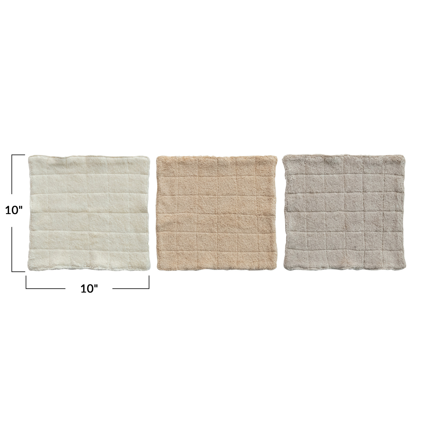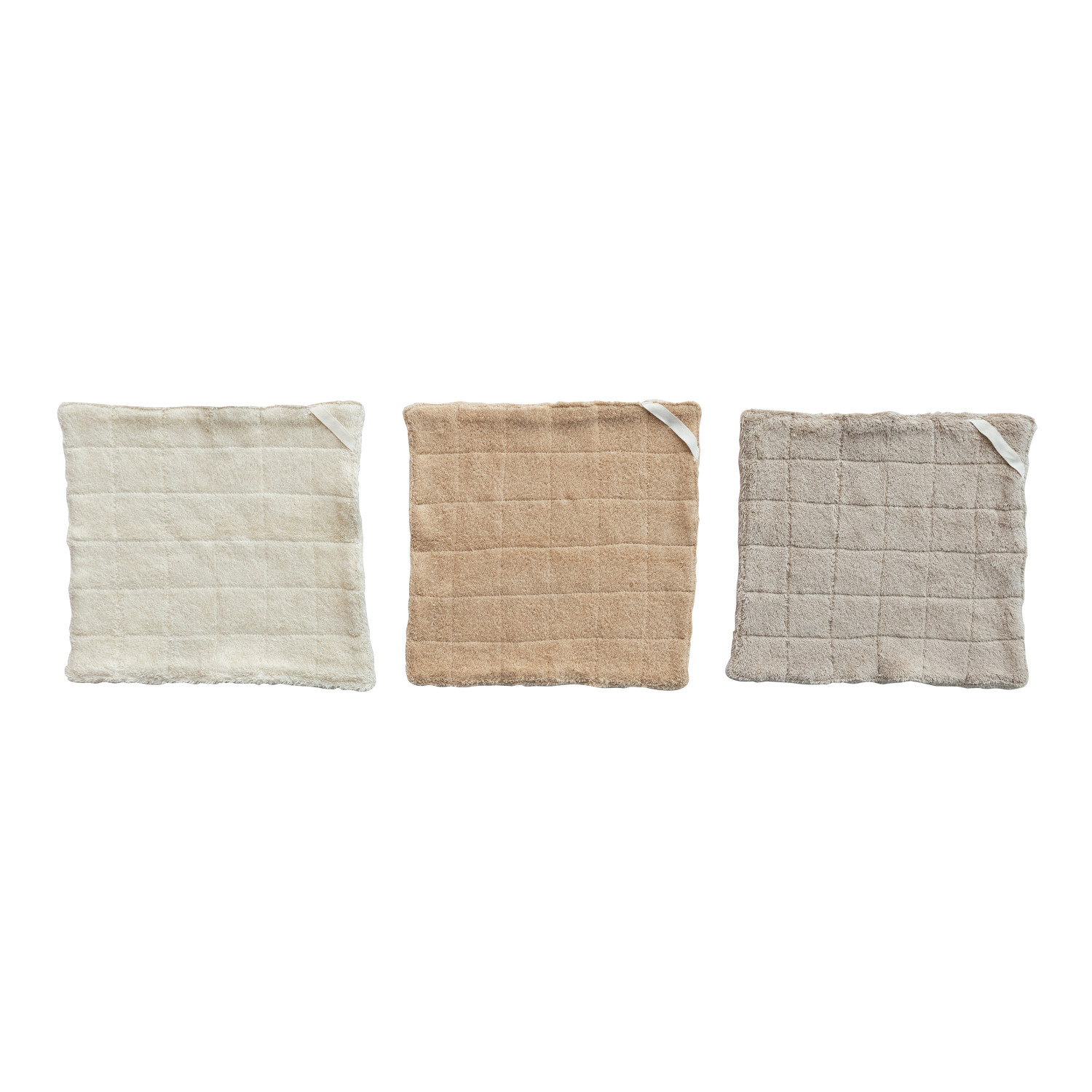 Catalog Name: 10" Square Quilted Cotton Terry Wash Cloth w/ Loop, 3 Colors