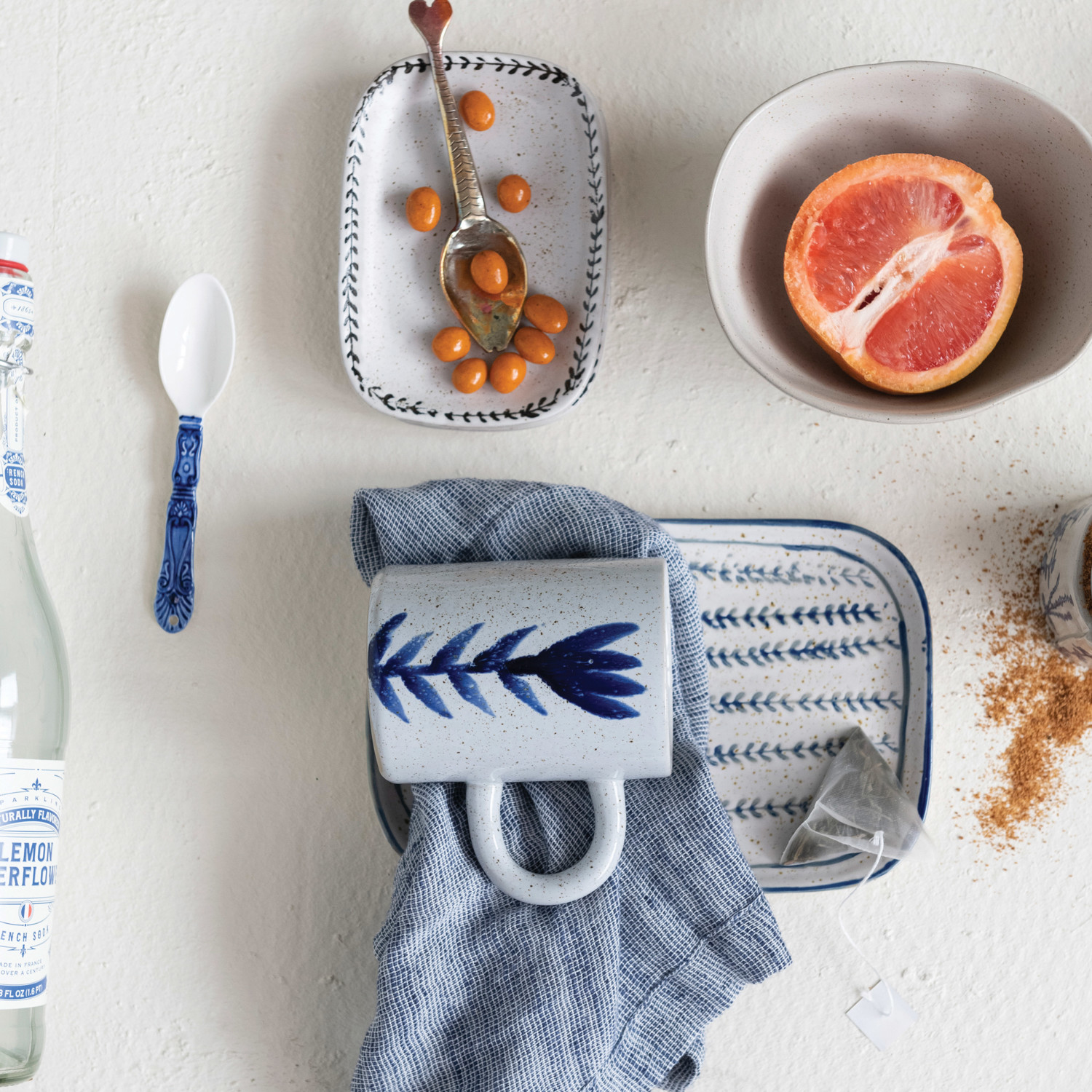 This artfully crafted stoneware mug showcases a hand painted floral design and naturally variating reactive glaze.