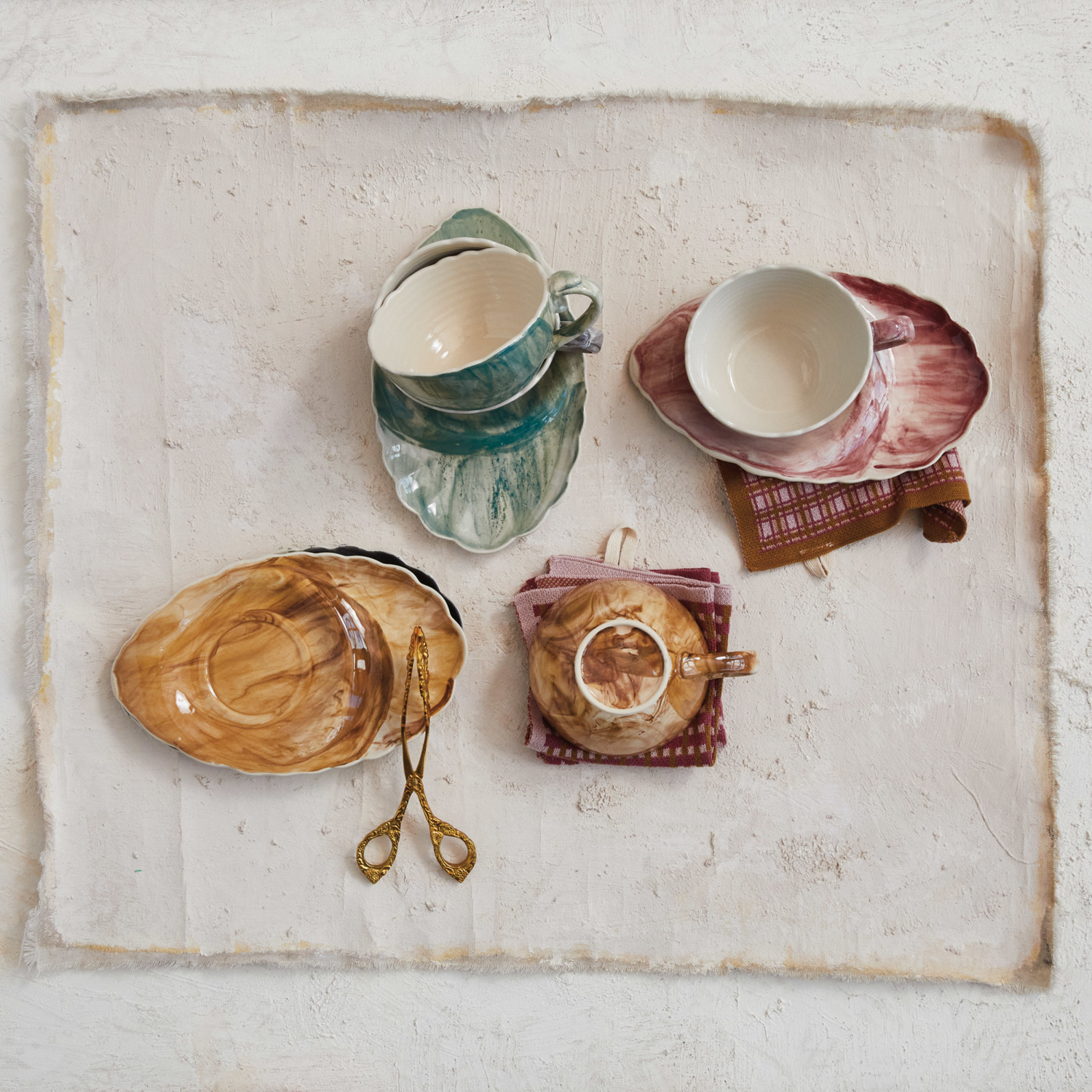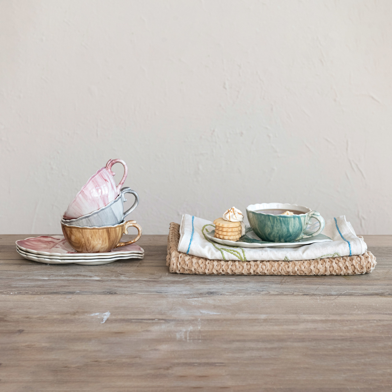 Catalog Name: 5"L x 6-1/2"W x 2-1/2"H 14 oz. Stoneware Teacup w/ 10-1/4"L x 6-1/4"W Saucer/Plate, Reactive Glaze, Set of 2, 4 Marbled Colors (Each One Will Vary)