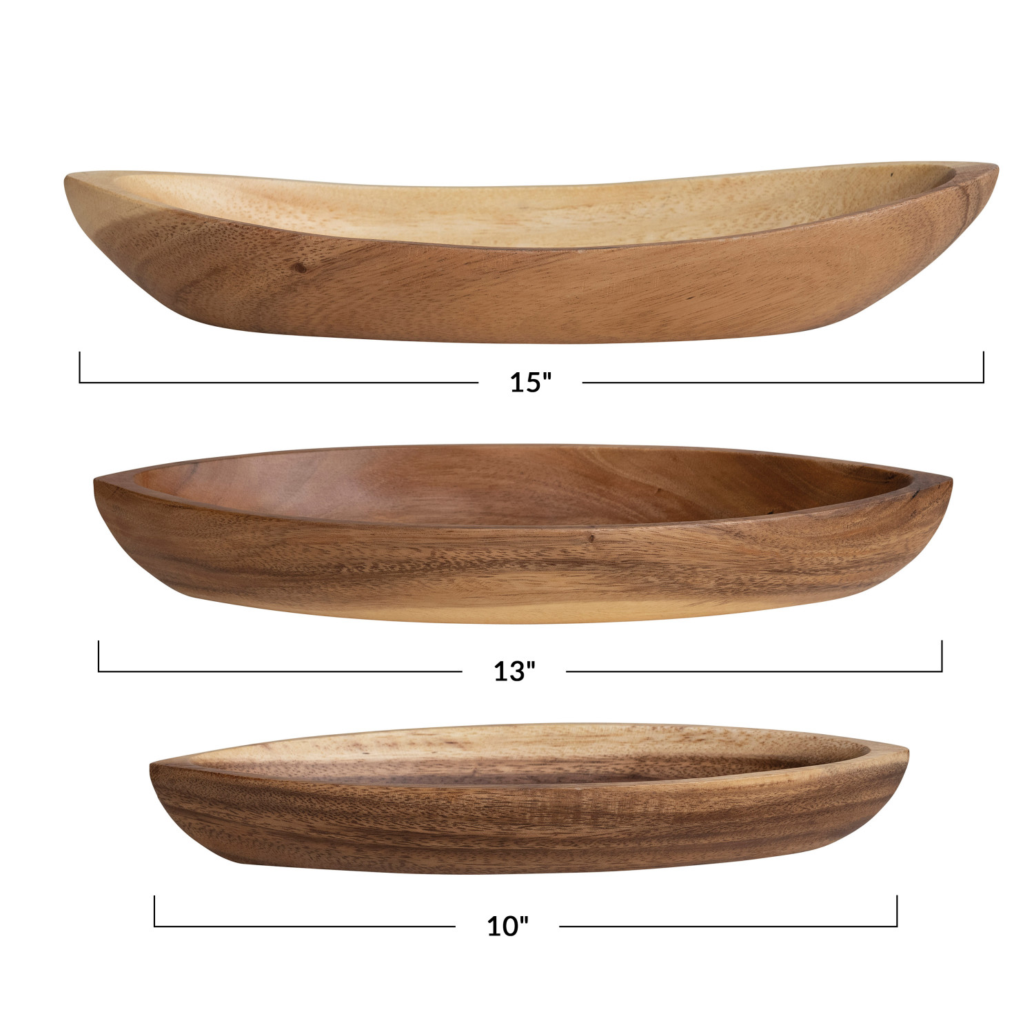 Catalog Name: 15"L x 5"W, 13"L x 4-1/2"W & 10"L x 3-1/2"W Acacia Wood Boat Shaped Bowls, Natural, Set of 3