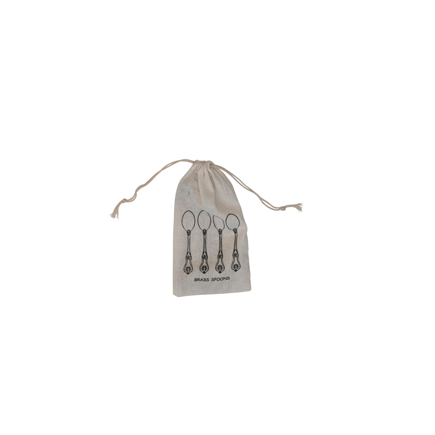 Catalog Name: 5"L Embossed Brass Spoons, Antique Silver Finish, Set of 4 in Printed Drawstring Bag