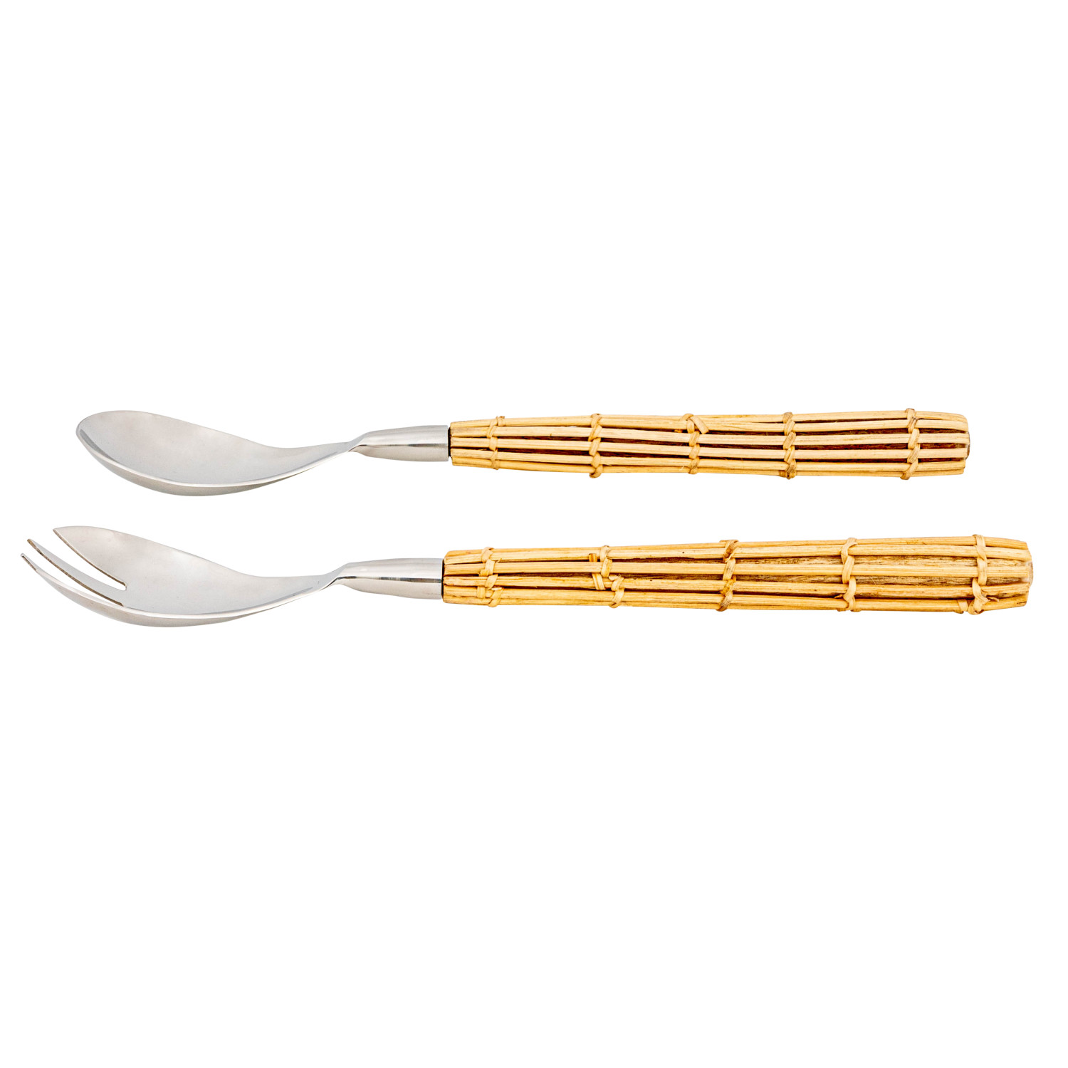 Catalog Name: 12"L Stainless Steel Salad Servers w/ Rattan Handles, Brass Finish & Natural, Set of 2 in Printed Drawstring Bag
