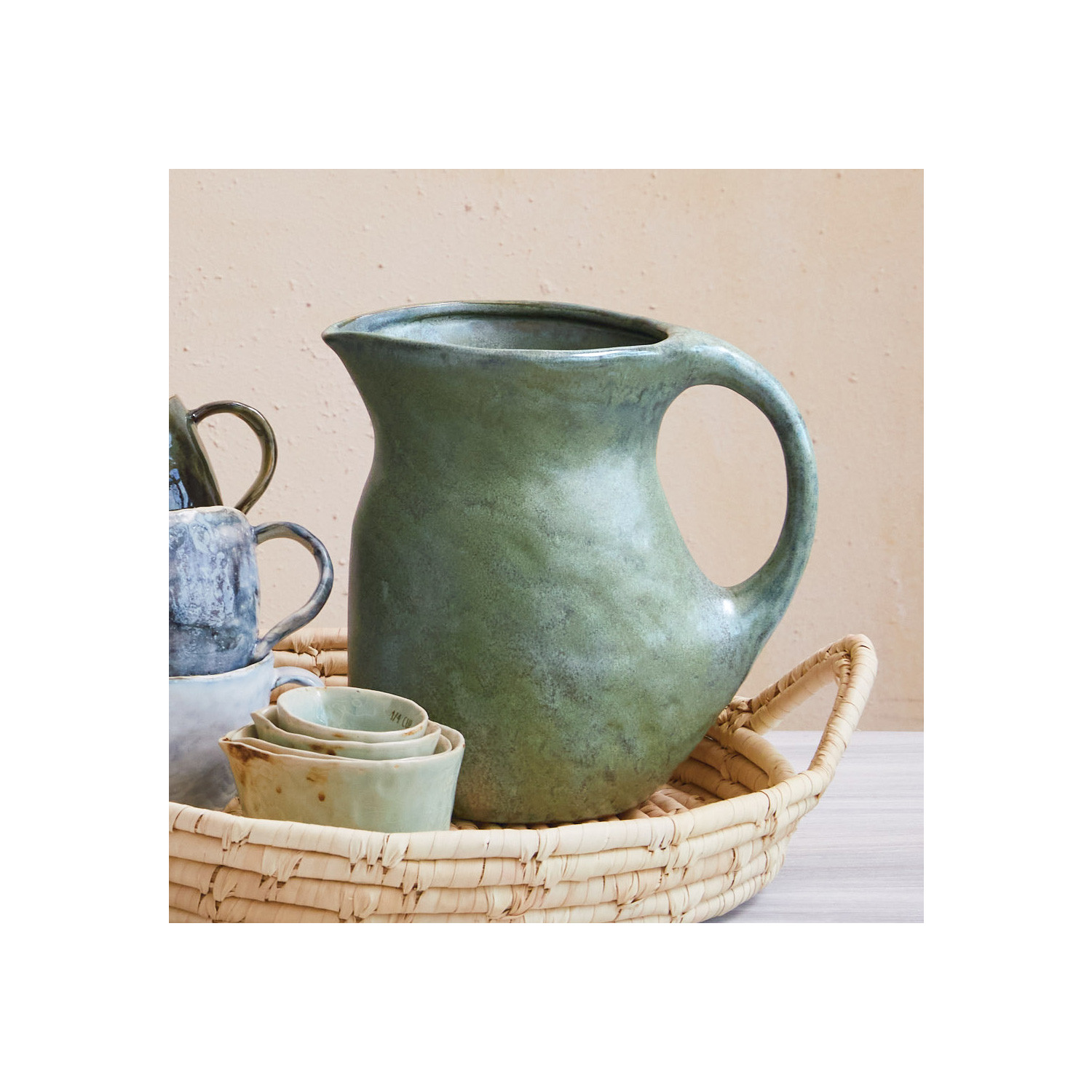 This stoneware pitcher with reactive glaze in matte teal is a stunning and practical addition to any home. It is made of stoneware, which is a premium and sturdy material that can withstand high temperatures and frequent use. It is microwave, oven, and dishwasher safe, making it easy and convenient to use and clean. It has a reactive glaze finish in matte teal, which creates a smooth and serene appearance. The glaze also makes each piece unique and slightly different. The pitcher has a round shape and a curved handle that makes it easy to hold and pour. It has a large capacity of 2.5 quarts, which is enough to serve a large group of people. It can be used for serving water, juice, milk, or tea, or for displaying flowers, plants, or utensils on a table or countertop. It can blend with any farmhouse, French country, coastal, lodge, or boho style kitchen or dining room. It measures 9 inches in length, 5 inches in width, and 8.5 inches in height, making it a generous and spacious pitcher. This will impress the guests and enhance the food presentation.