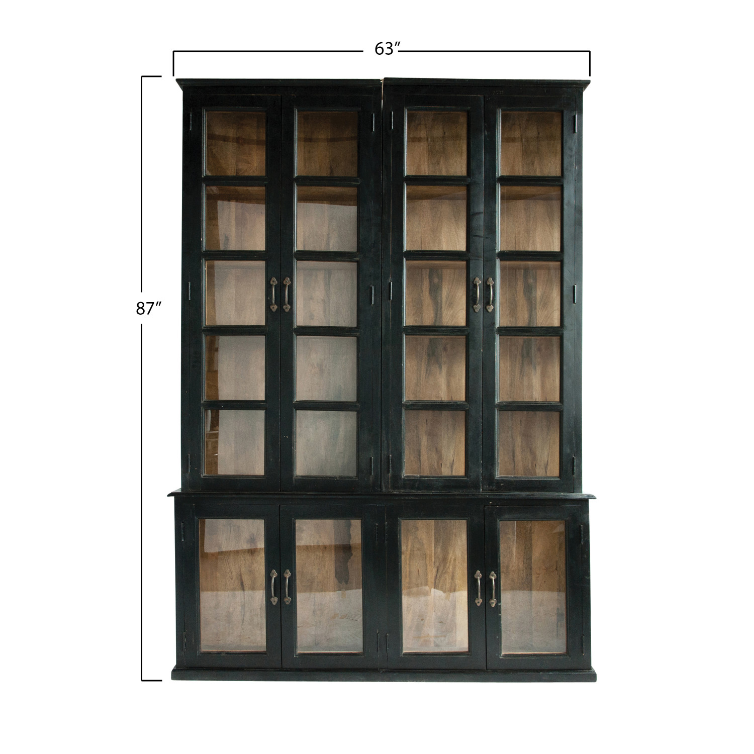 Catalog Name: 63"W x 11"D x 87"H Wood & Glass 2-Piece Cabinet w/ 8 Doors & 10 Shelves, Black & Natural, Truck Ship