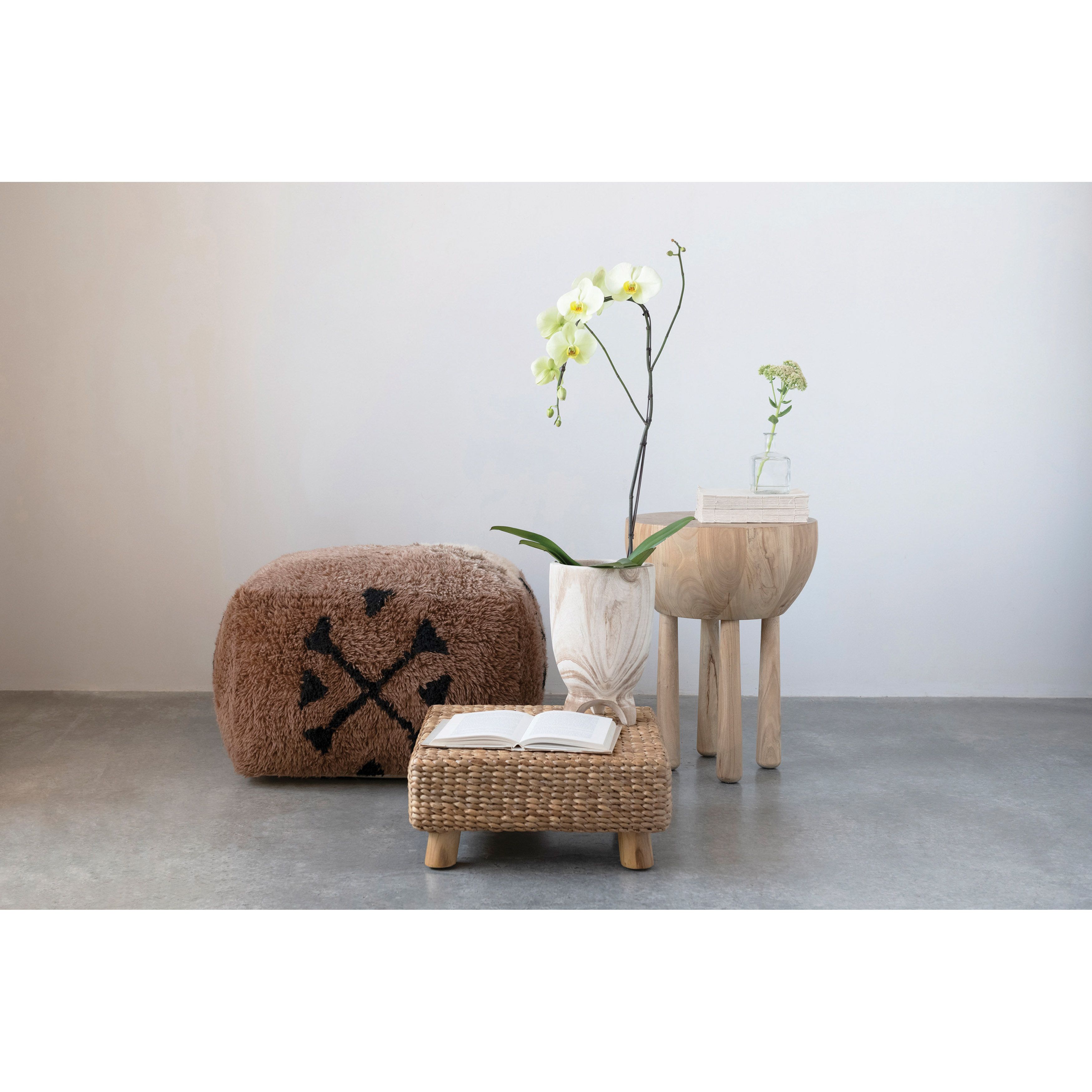 This statement-making pouf features luxurious new zealand wool in a bold, abstract design. Multicolor new zealand wool pouf with abstract design. Spot clean only. Upholstery is made from new zealand wood and cotton.