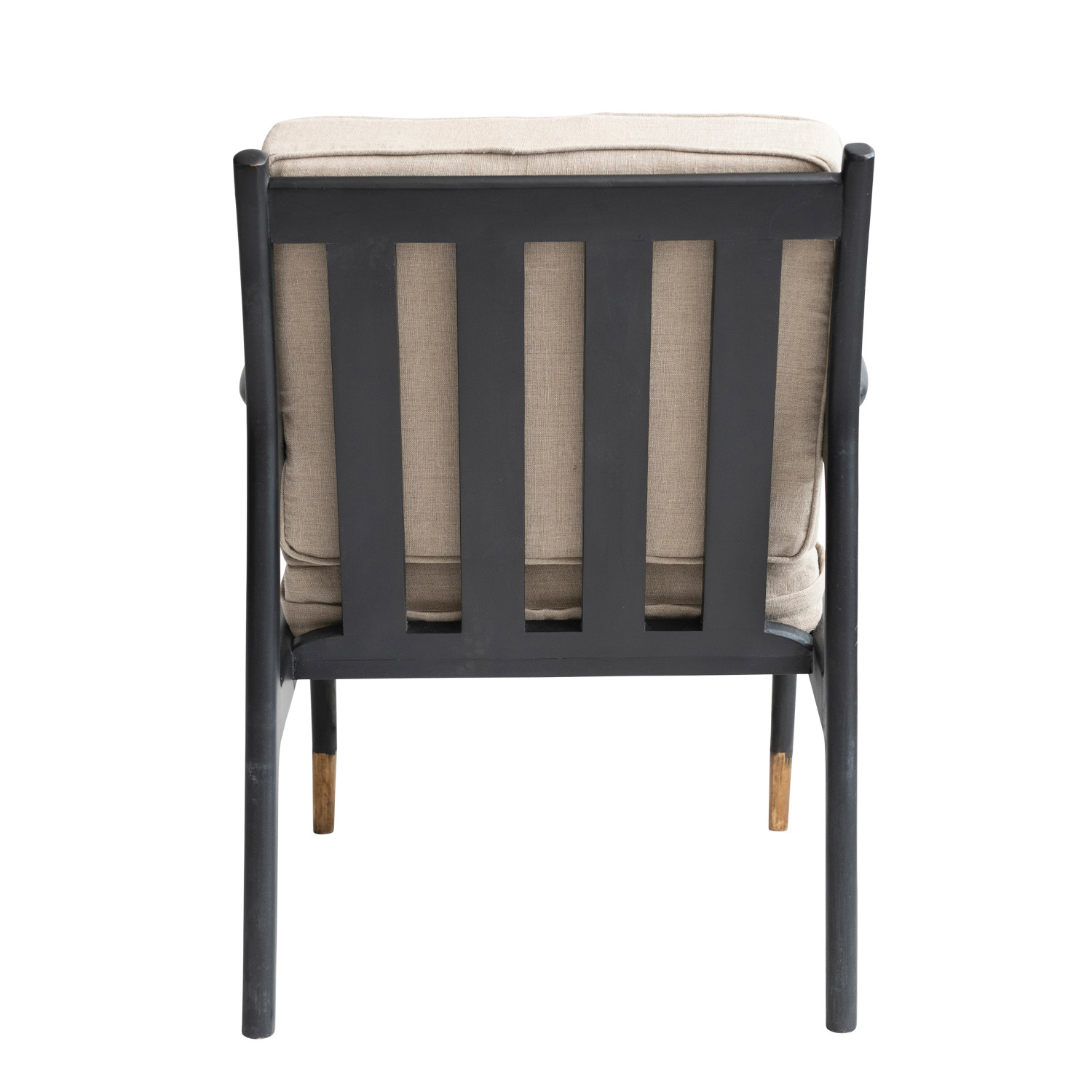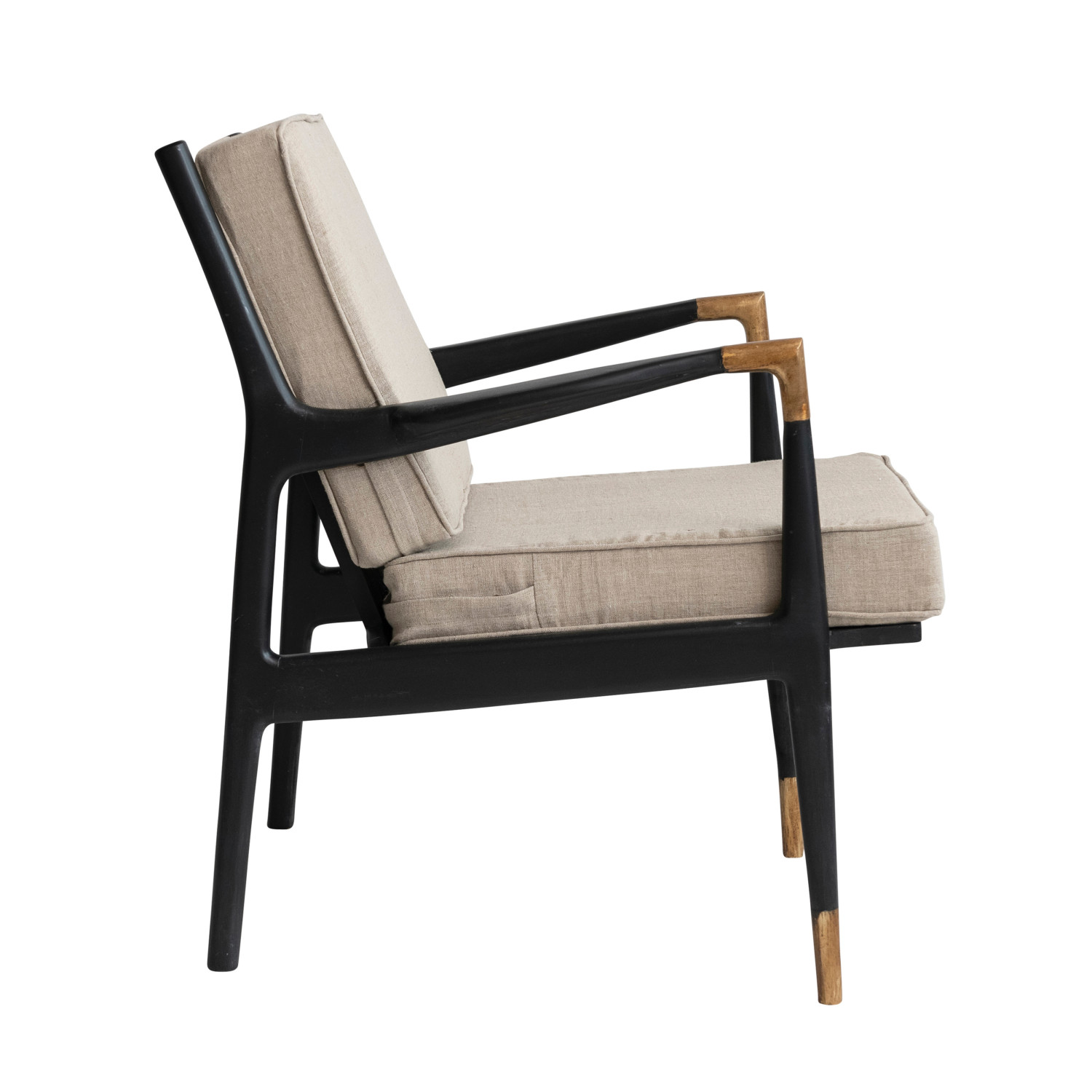 Mango Wood Chair w/ Linen Cushions & Metal Capped Feet & Armrests, Black & Brass Finish