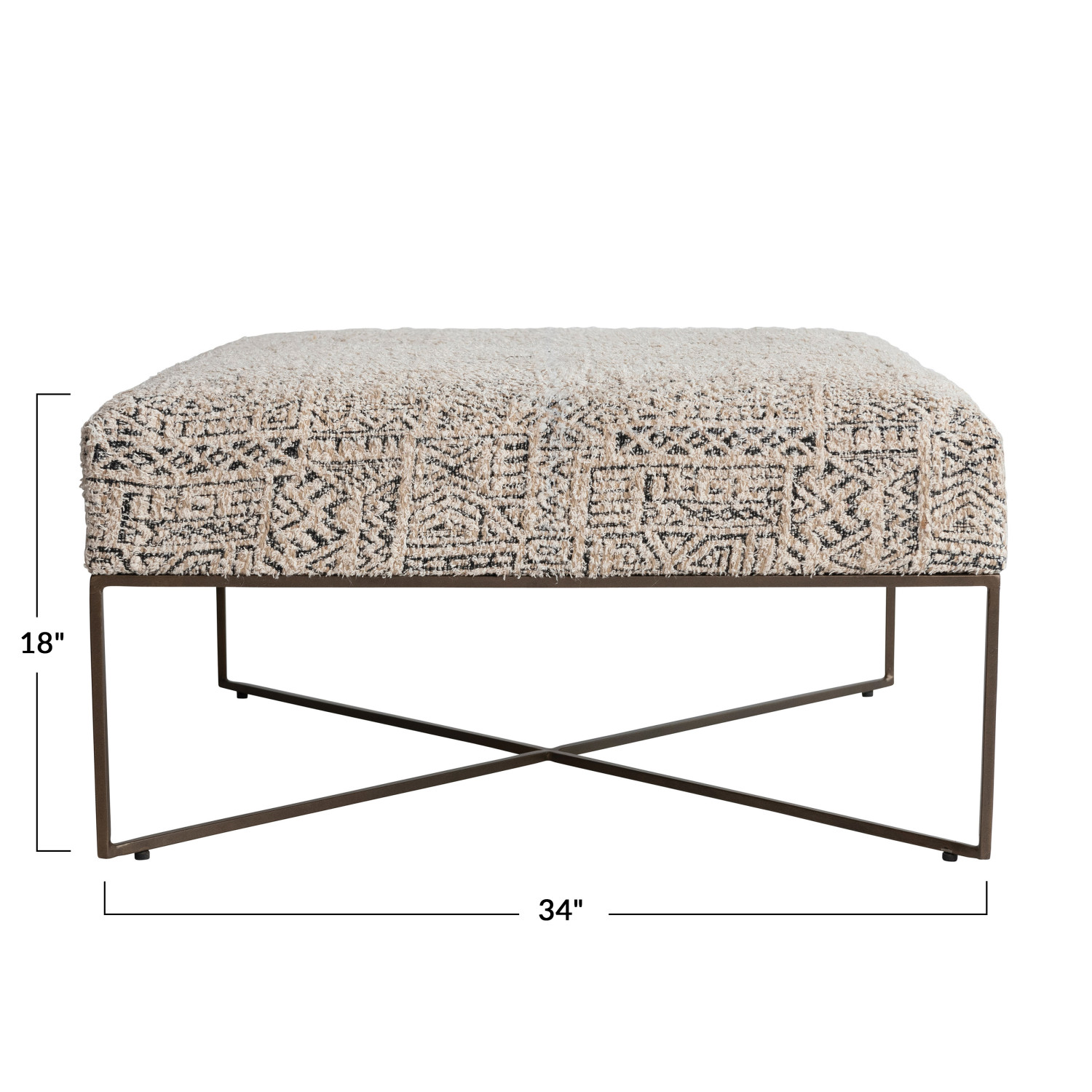 Catalog Name: 34" Square x 18"H Metal & Woven Damask Upholstered Ottoman, Antique Brass Finish, Cream Color & Black, Truck Ship