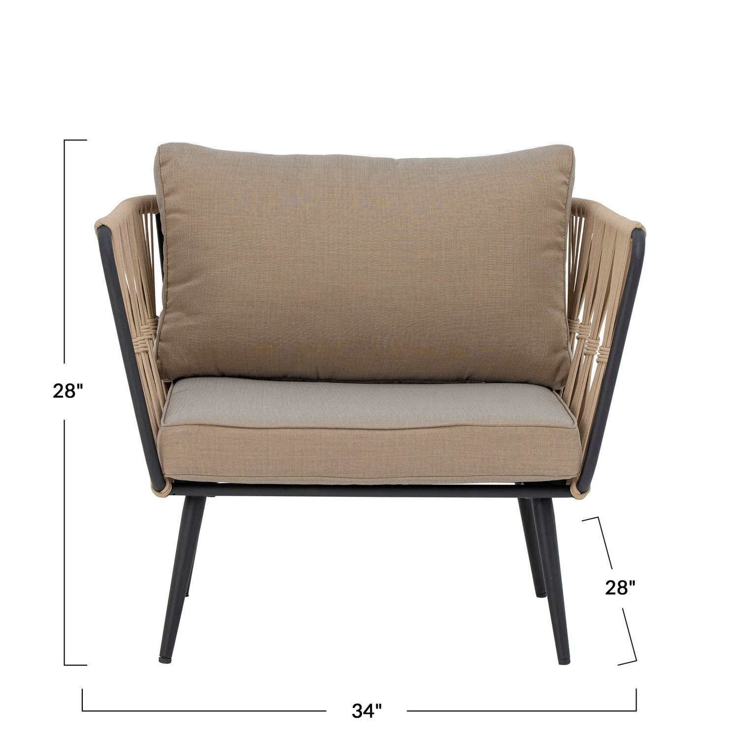 This metal and woven rope indoor/outdoor chair with striped cushions is a versatile and attractive piece of furniture that will enhance any space. It is made of high-quality metal and rope that has a black and cream color scheme that adds contrast and elegance to the chair. The chair has a metal frame that supports a woven rope design that covers the seat, back, and arms of the chair. The rope design is flexible and breathable and has a textured and natural look. The chair also has striped fabric cushions that are soft and comfortable to sit on. The cushions have a black and cream color scheme that matches the rope design, and have a striped pattern that adds fun and flair to the chair. The chair can be used indoors or outdoors, as it is durable and weather-resistant. The chair has a weight capacity of 250 pounds, making it sturdy and reliable. The chair measures 34.25 inches in length, 28.5 inches in width, and 29.25 inches in height, making it a perfect size for any space. This metal and woven rope indoor/outdoor chair is a great choice for adding farmhouse, coastal, Scandinavian, lodge, or transitional style to the home.