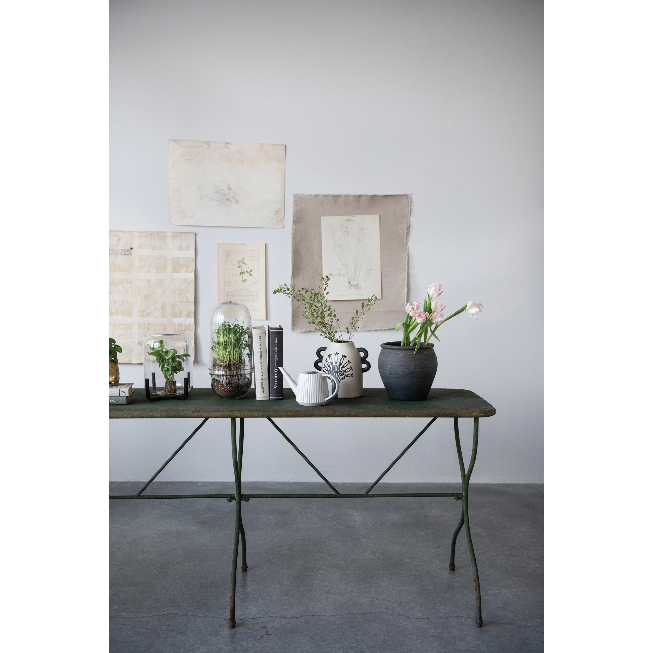 A unique and charming piece of furniture awaits to enhance the home with this distressed green metal console table. It features a long and narrow design that suits any style of home decor, from farmhouse to industrial. The metal has a distressed green finish that gives the table a weathered antique look. The finish also adds character and charm to the table, making it stand out in the space. The table is easy to assemble with the included hardware and instructions. Simple steps are provided for a quick and hassle-free setup. The table measures 72 inches in length, 19.5 inches in width, and 29.5 inches in height. It has a weight capacity of 176 pounds, allowing for displaying various decor items, photos, or plants on it without worry. This console table can also serve as a buffet table, a sofa table, or a media console, depending on the needs and preferences. This distressed green metal console table adds charm and functionality to the home.