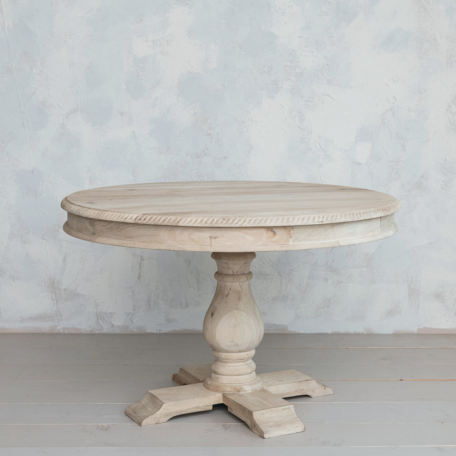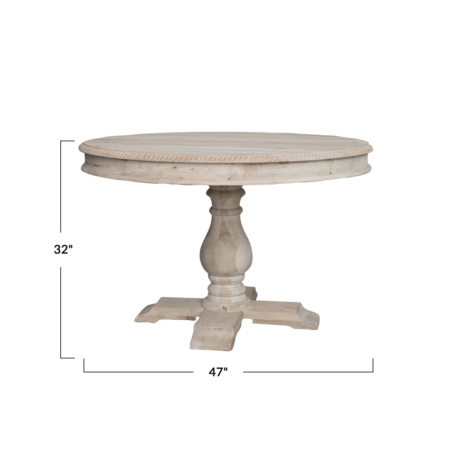 Catalog Name: 47" Round x 32"H Carved Mango Wood Table, Bleached, KD, Truck Ship