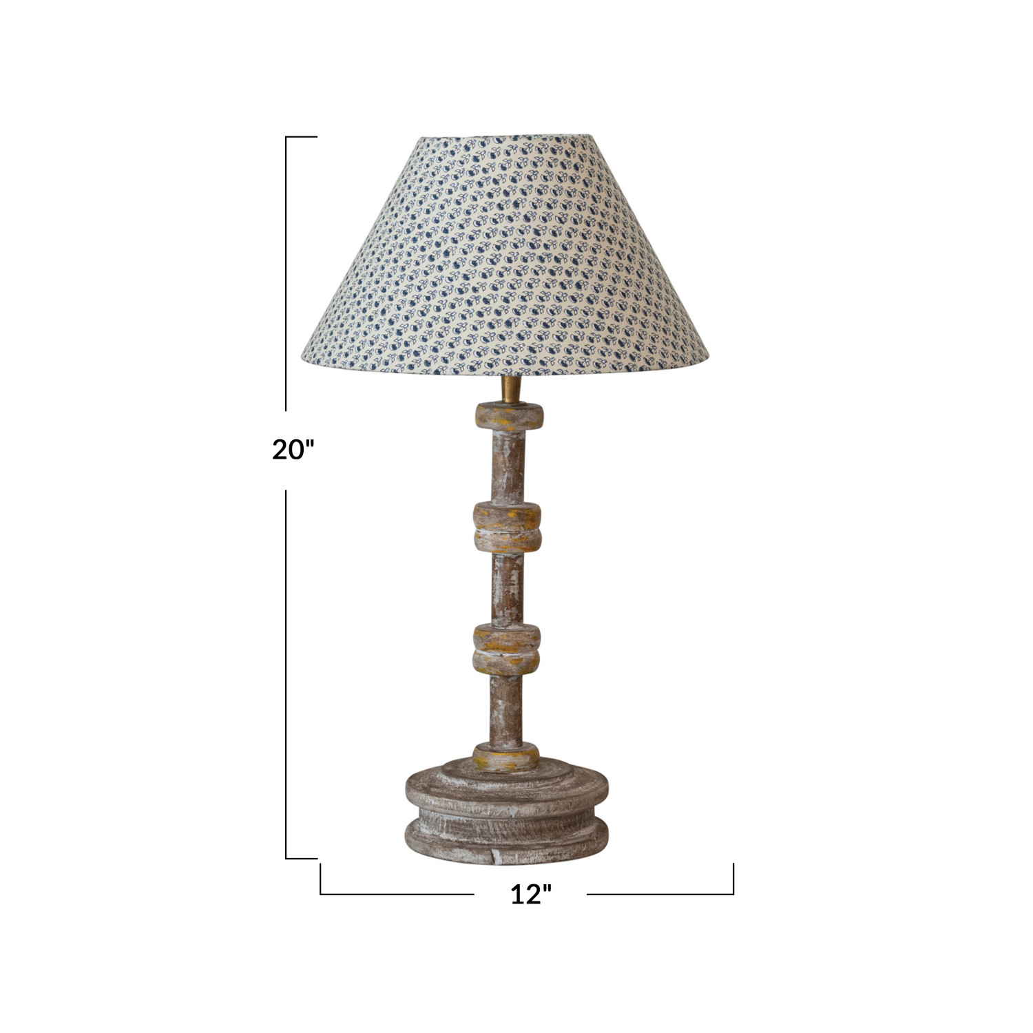 Catalog Name: 12" Round x 20"H Found Wood Spool Table Lamp w/ Printed Cotton Floral Chintz Shade, Swivel Neck & Inline Switch, Whitewashed, Blue & Natural (Each One Will Vary)