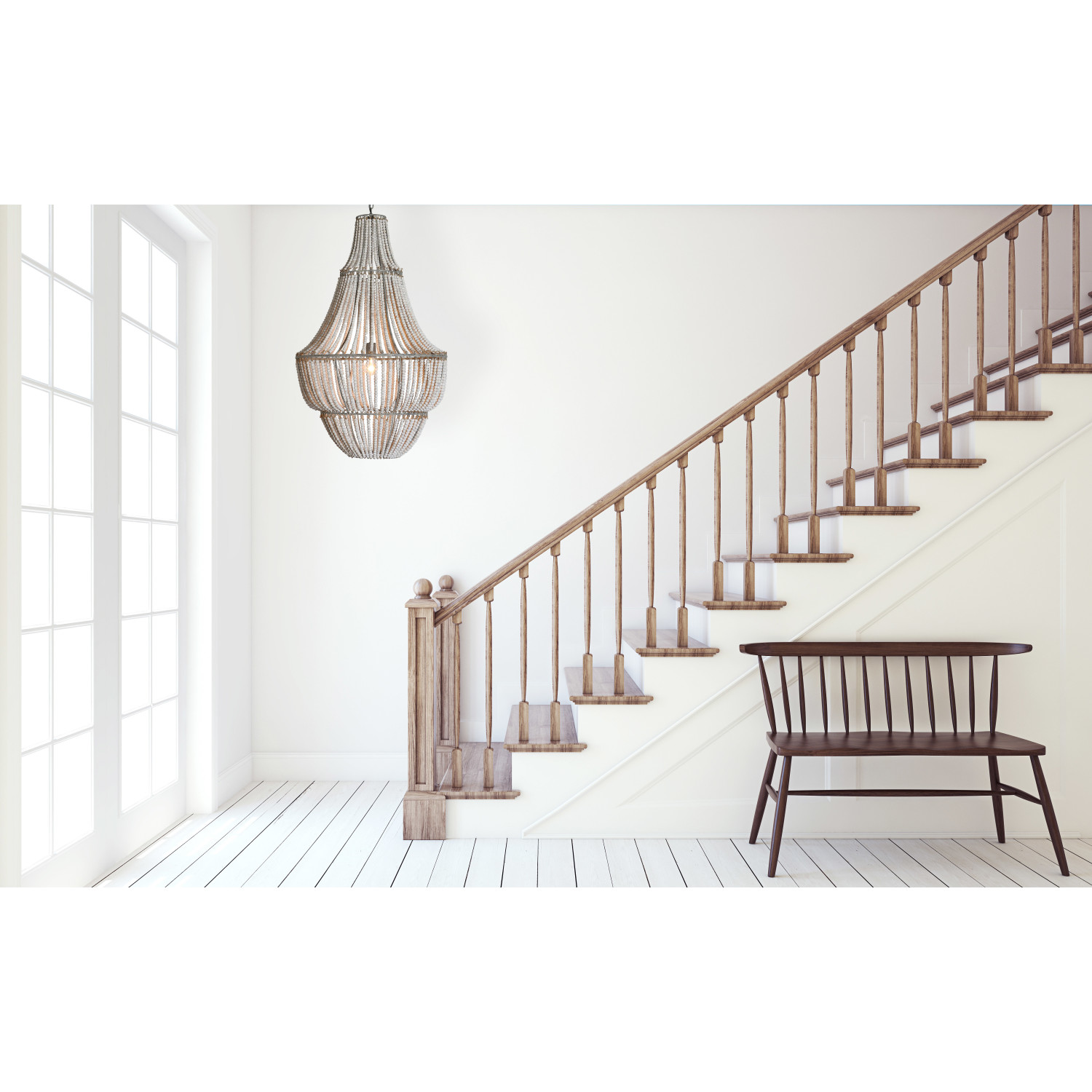 Catalog Name: 25-1/2" Round x 41-1/4"H Metal & Wood Bead Chandelier, 6' Chain & 10' Cord, Whitewashed, Truck Ship (40 Watt Bulb Maximum, Hardwire Only)