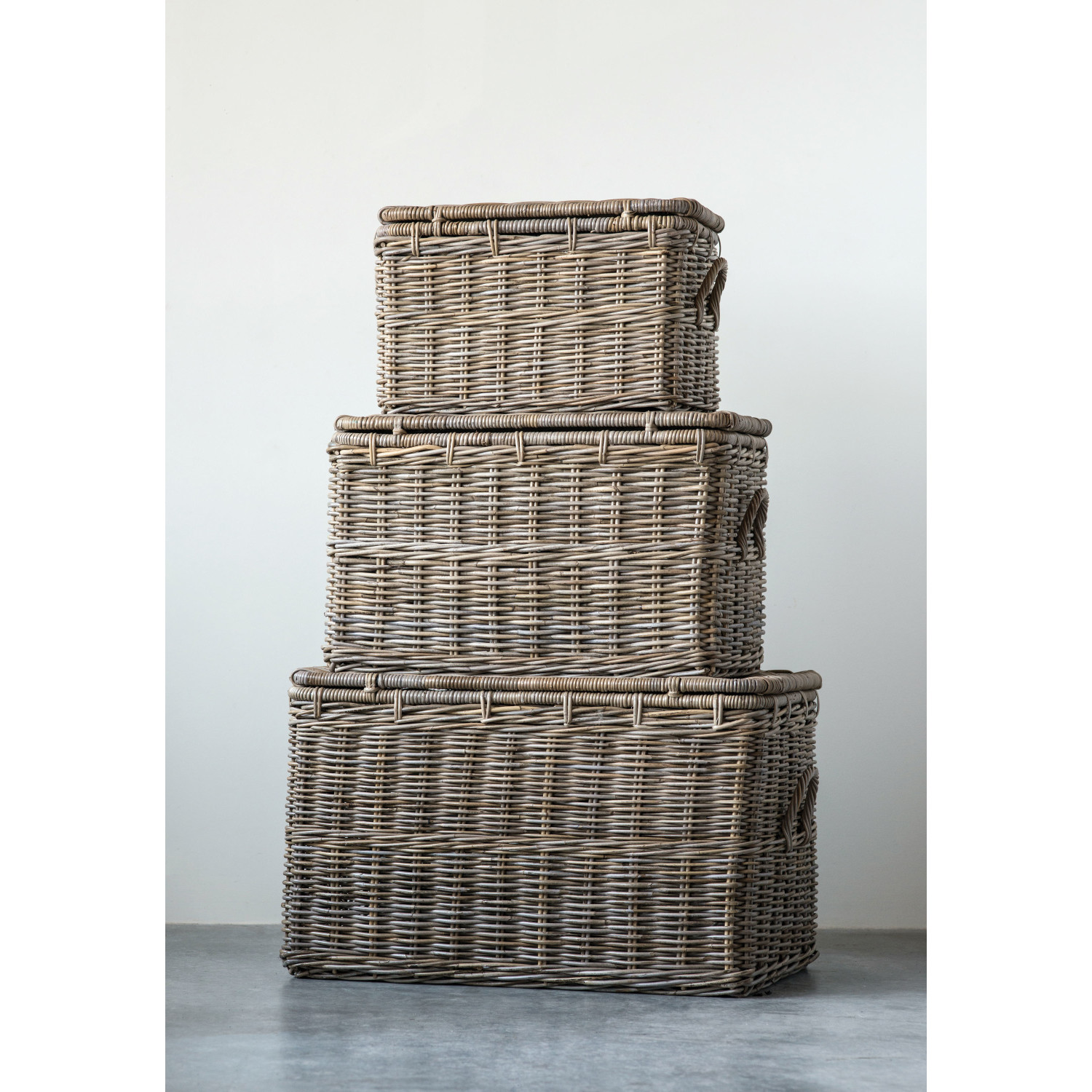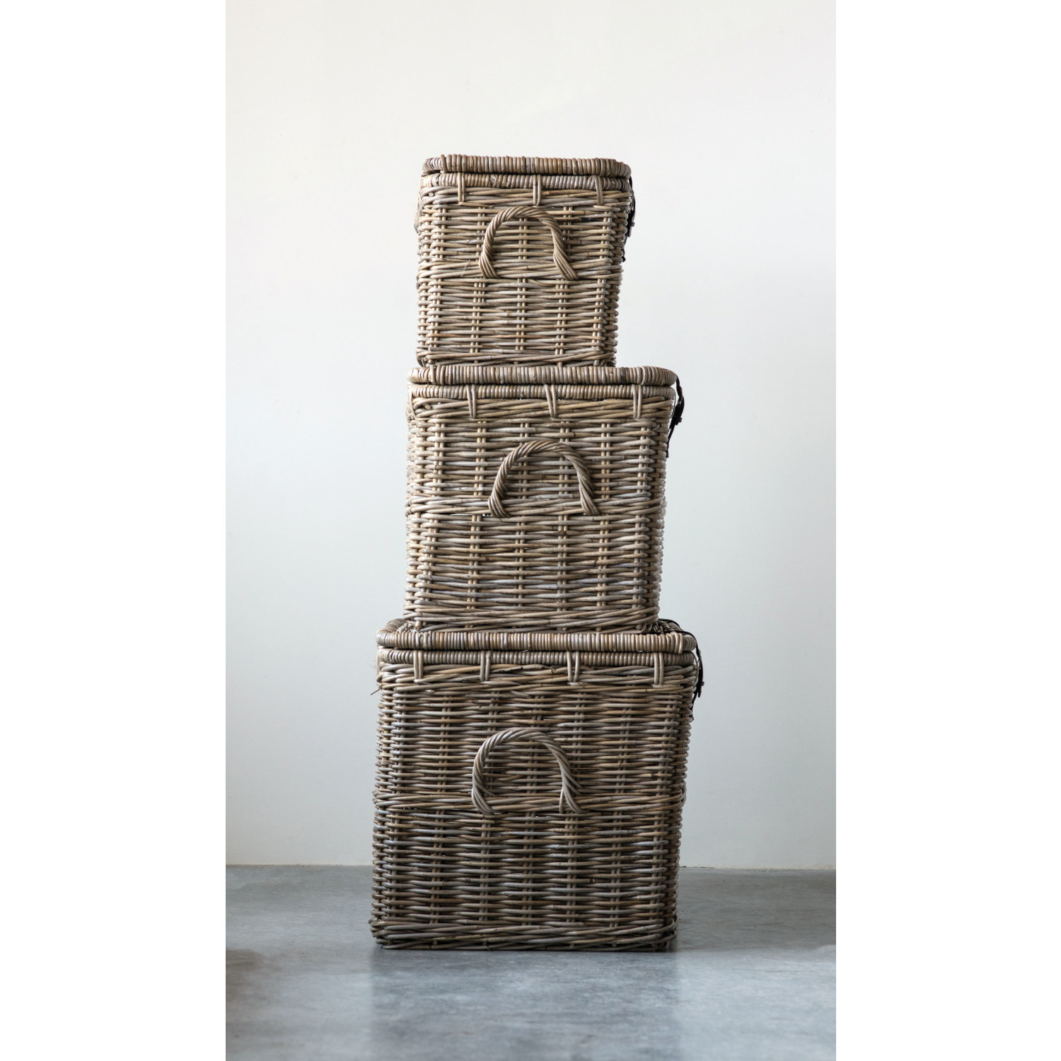 Catalog Name: 36"L x 22-1/2"W x 22"H, 30-1/2"L x 19-1/4"W x 18-3/4"H & 24"L x 15-1/4"W x 14-3/4"H Rattan Baskets w/ Lids & Leather Buckles, Natural, Set of 3, Truck Ship
