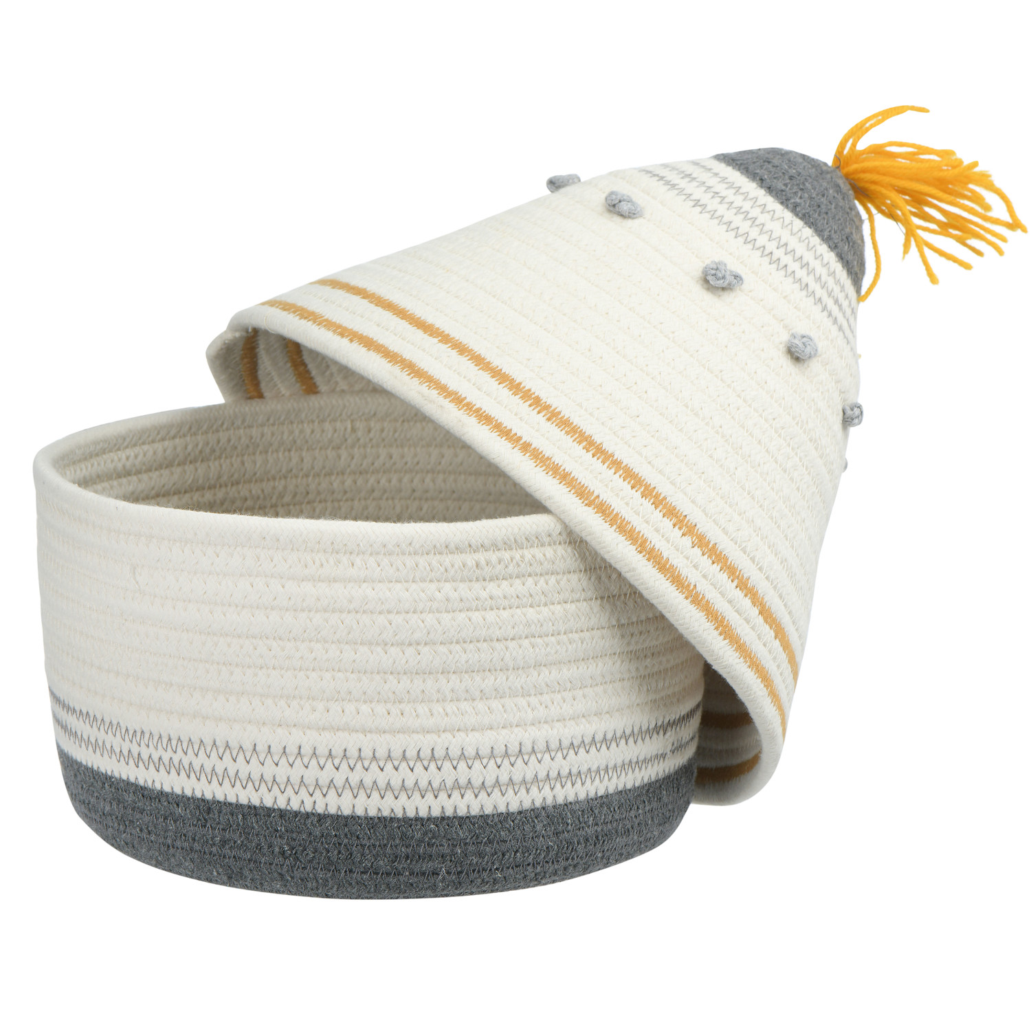 Catalog Name: 9-1/2" Round x 11"H Cotton Rope Basket w/ Lid & Embroidery, Grey & Mustard Color