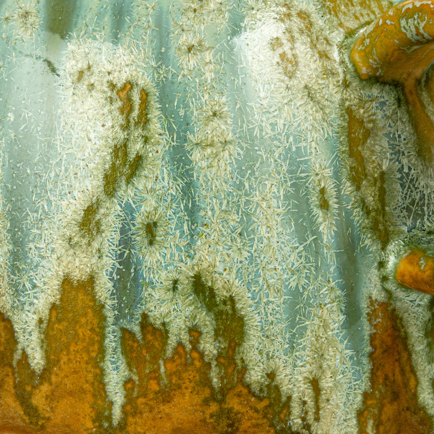 This stoneware oil lamp with handle, reactive glaze, multi color is a beautiful and practical piece for any home. It consists of a round base and a metal handle that feature a stoneware construction and a reactive glaze. The stoneware construction is durable and heat-resistant, which makes this oil lamp last for a long time. The reactive glaze creates a rustic and colorful effect that makes each oil lamp different and special. The multi color adds a touch of warmth and vibrancy to this oil lamp. It is perfect for creating a warm and cozy ambiance in the living room, bedroom, or patio. It can also be used as a decorative accent on a shelf, table, or mantel. This oil lamp is easy to clean and maintain, and it will enhance any space with its beauty and style. It measures 4.5 inches in diameter and 4.25 inches in height (Each one will vary due to the nature of the glaze), making it suitable for any space. This stoneware oil lamp with handle, reactive glaze, multi color is a must-have for anyone who loves style and coziness.