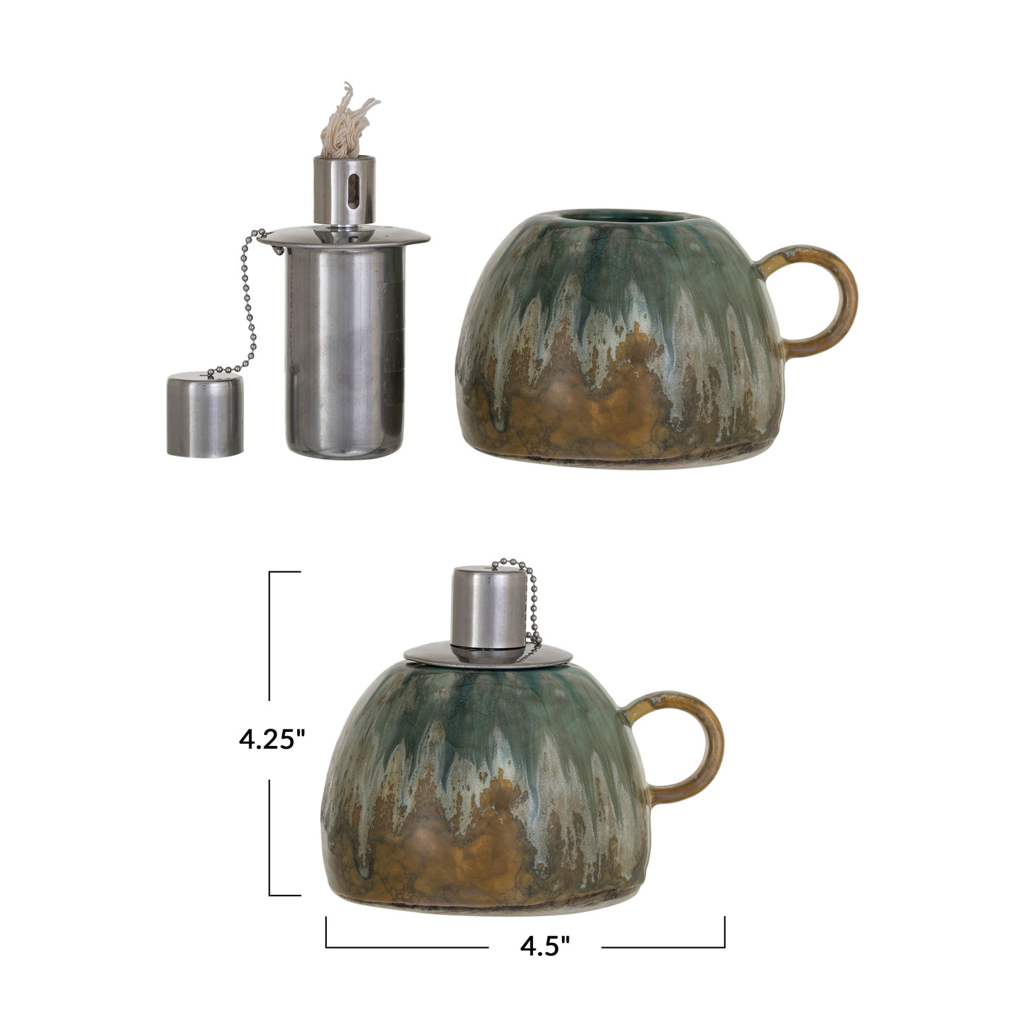 Catalog Name: 4-1/2" Round x 4-1/4"H Stoneware Oil Lamp w/ Handle & Metal Insert, Reactive Glaze, Multi Color (Each One Will Vary)