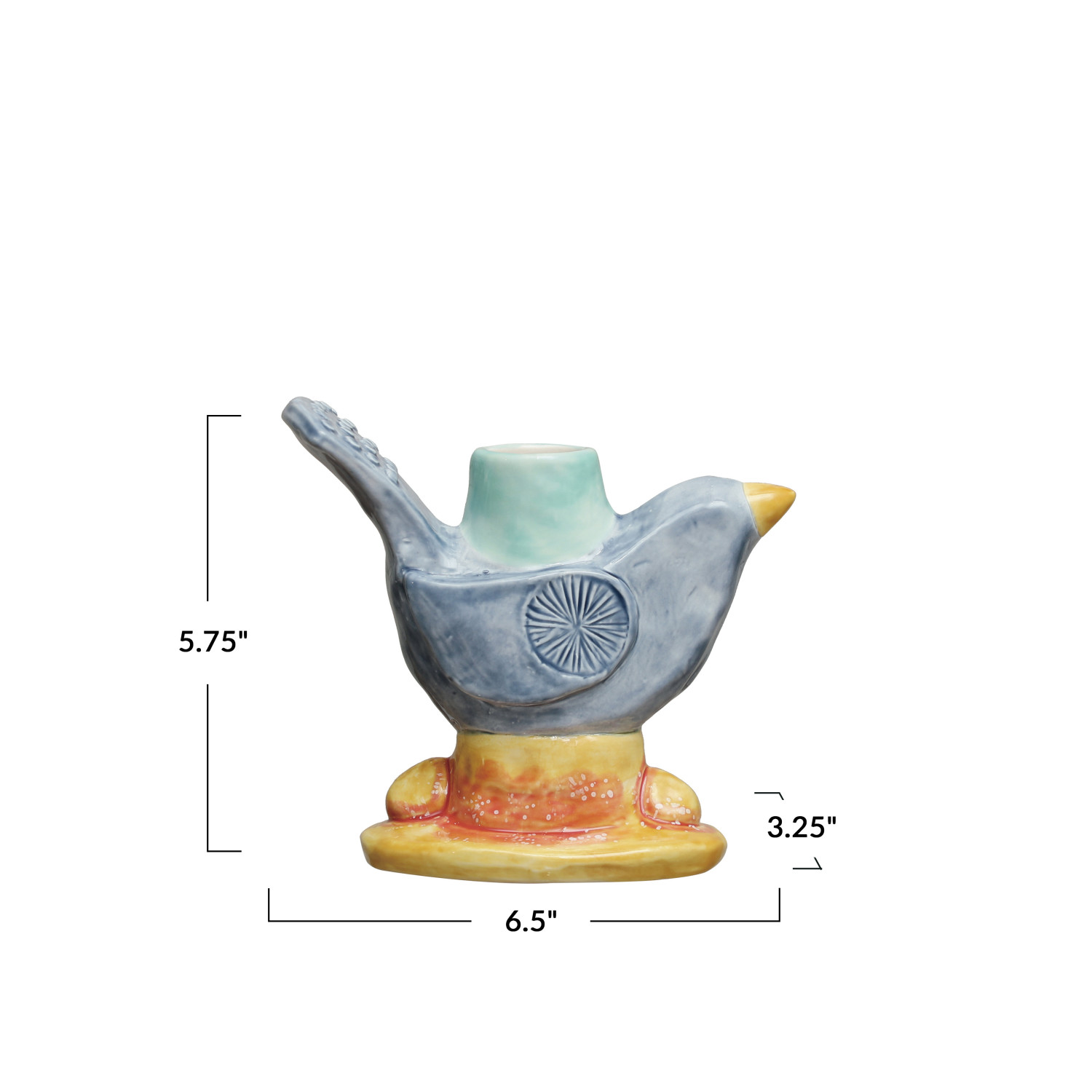 This Chirpy Elegance Stoneware Taper Holder is a delightful addition to any home seeking a blend of whimsy and elegance. Measuring 6.5 inches in length and 5.75 inches in height, it's perfectly sized to hold a taper candle, casting a warm and inviting glow. The multi-colored stoneware is meticulously crafted into the shape of a bird, offering a unique and eye-catching design. Whether placed in a Scandinavian-inspired study, a Boho-chic bedroom, or a French Country dining room, this taper holder is sure to enchant. The intricate details and vibrant colors of this piece make it a charming accent that will surely spark conversation among guests. Its versatility allows it to seamlessly fit into a variety of decor styles, adding a touch of personality to any room.