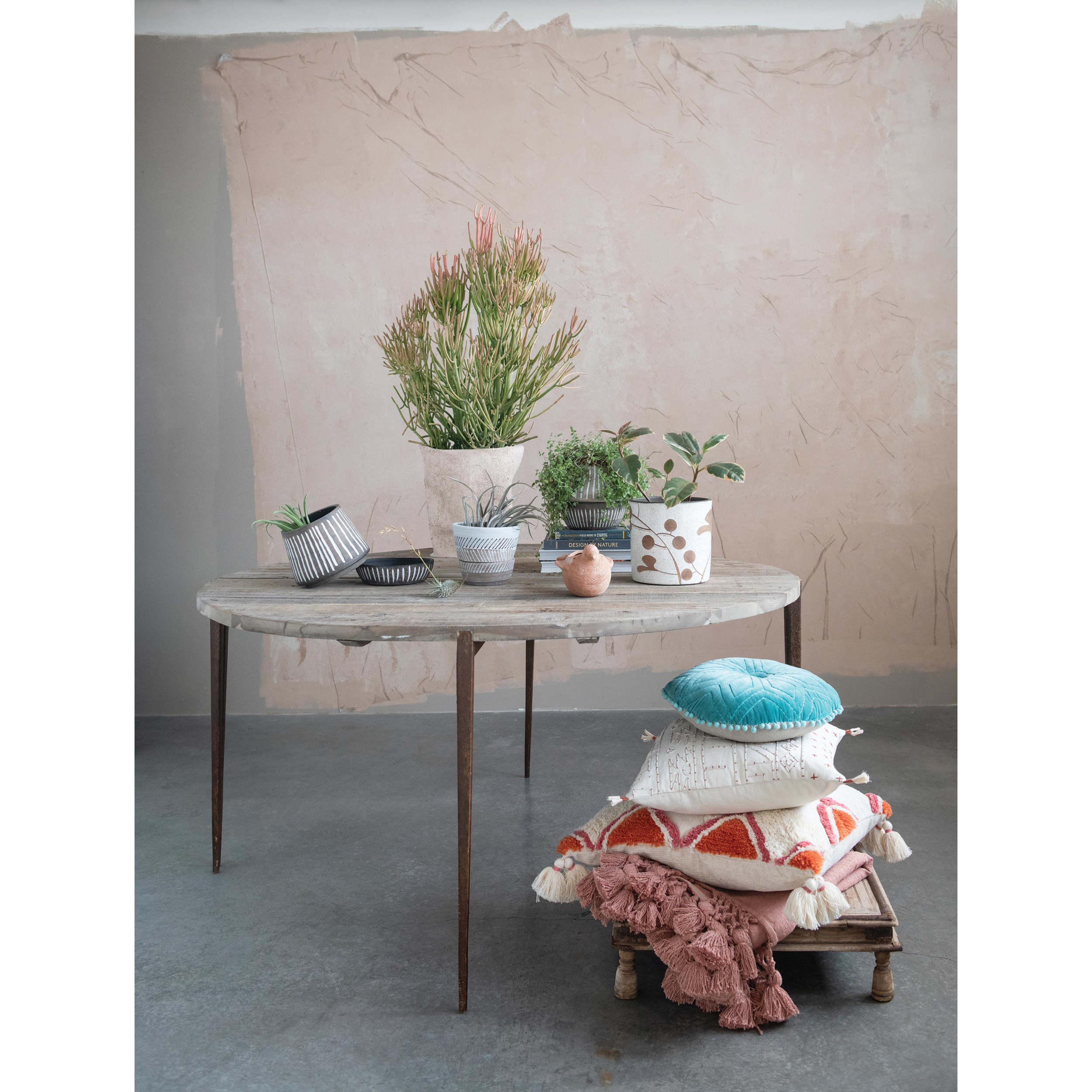 Display plants in a chic and sophisticated way with this hand-painted terra-cotta planter with saucer and debossed lines. This planter is made of high-quality terra-cotta that complements any plant. It also has a saucer that catches excess water and prevents spills to keep plants healthy and happy. This planter has a grey and beige color scheme that creates a neutral and elegant look. It also has a debossed line pattern that adds texture and depth to the space. Use it for indoor or outdoor plants, such as succulents, herbs, or flowers. Place it on the windowsill, shelf, table, or deck to create a beautiful and inviting atmosphere in the home. This planter measures 7.5 inches round and 7 inches tall and can hold a 5-inch pot. This hand-painted terra-cotta planter with saucer and debossed lines is a chic and sophisticated way to display plants in the home.