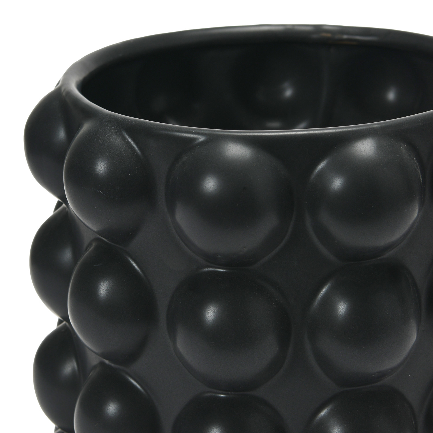 A stunning stoneware planter that features a matte black finish and a textured surface with raised dots. This planter is perfect for adding a touch of modern elegance and sophistication to any space. It can hold an 8-inch pot, or plant it directly into it with some pebbles at the bottom for drainage. Made of stoneware.
