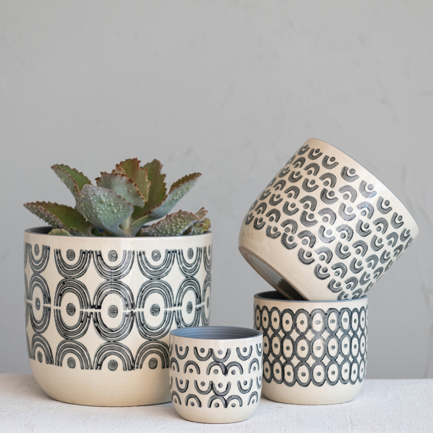 Hand-Painted Stoneware Planters w/ Patterns, Cream Color & Black, Set of 4