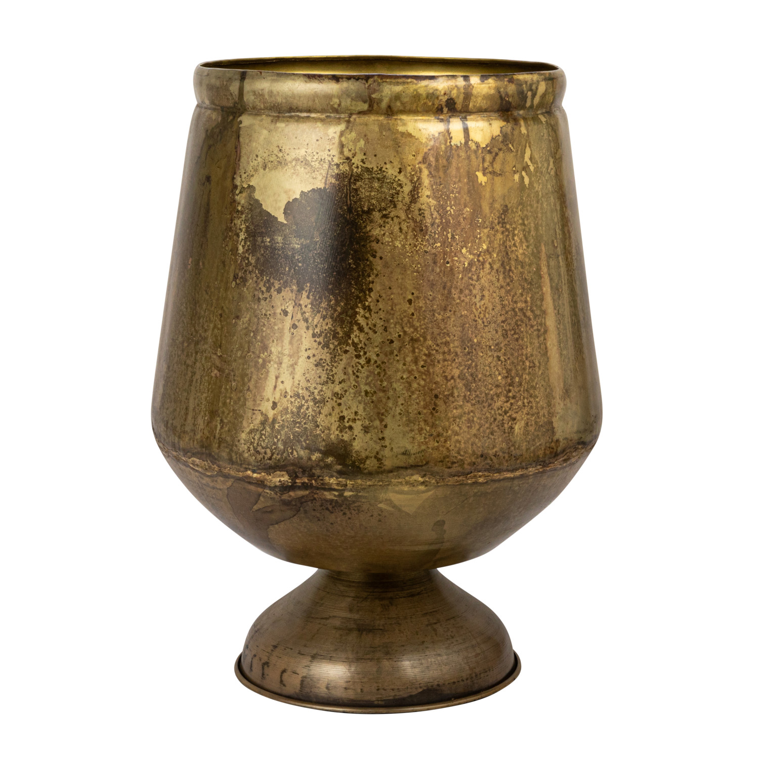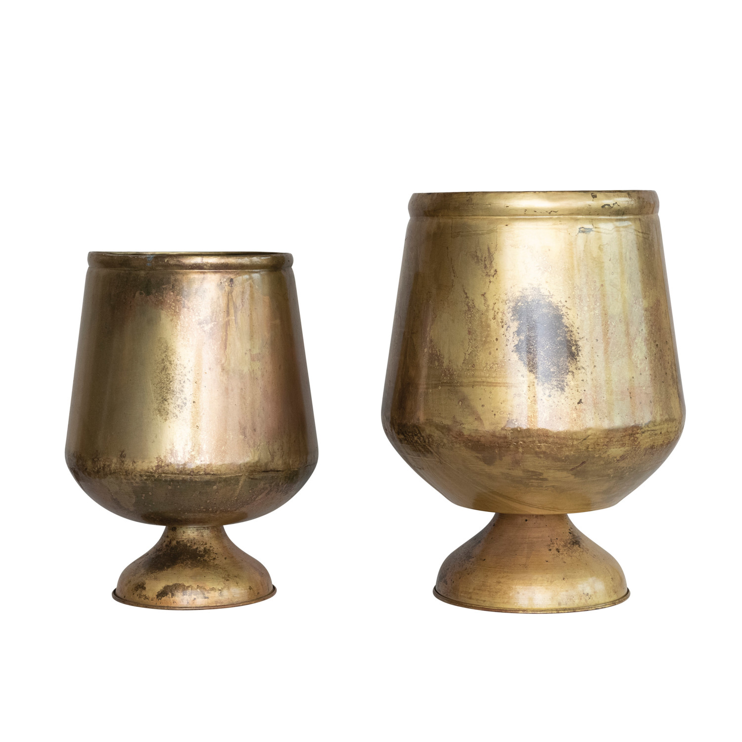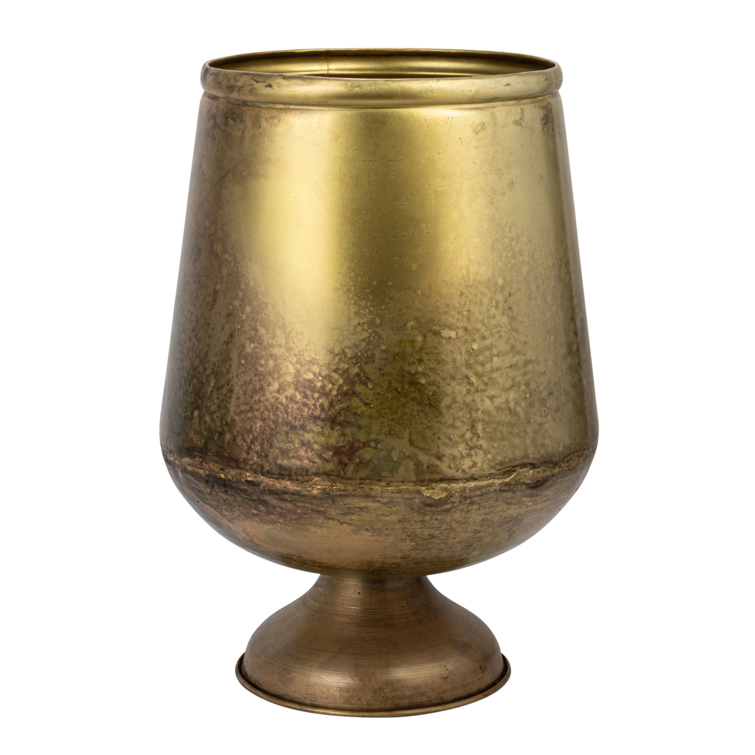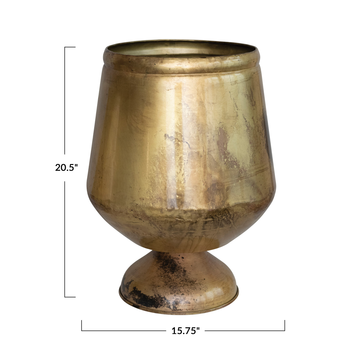 Add some style and sophistication to the home with this antique brass metal footed planter. This planter features a metal material with an antique brass finish that creates a vintage and elegant look. The antique brass finish reflects light and adds some sparkle to any space. The planter has a round shape and a footed base that adds some interest and stability to the space. The footed base elevates the planter from the ground and adds some height and dimension to the space. The planter measures 15.75-inch round by 20.5 inches height and holds a 10-inch pot. Use it indoors or outdoors, as it is made of high-quality metal that can withstand the elements. Use it with any type of plant, whether they are succulents, ferns, or flowers. Use it as a centerpiece on the dining table, a mantel decoration, or a shelf accent. This planter is suitable for modern, contemporary, or minimalist style décor. This planter is made of metal with an antique brass finish that gives it a vintage and elegant feel. This planter is suitable for modern, contemporary, or minimalist style décor. The planter has a round shape and a footed base that adds some interest and stability to any space. Made of metal.