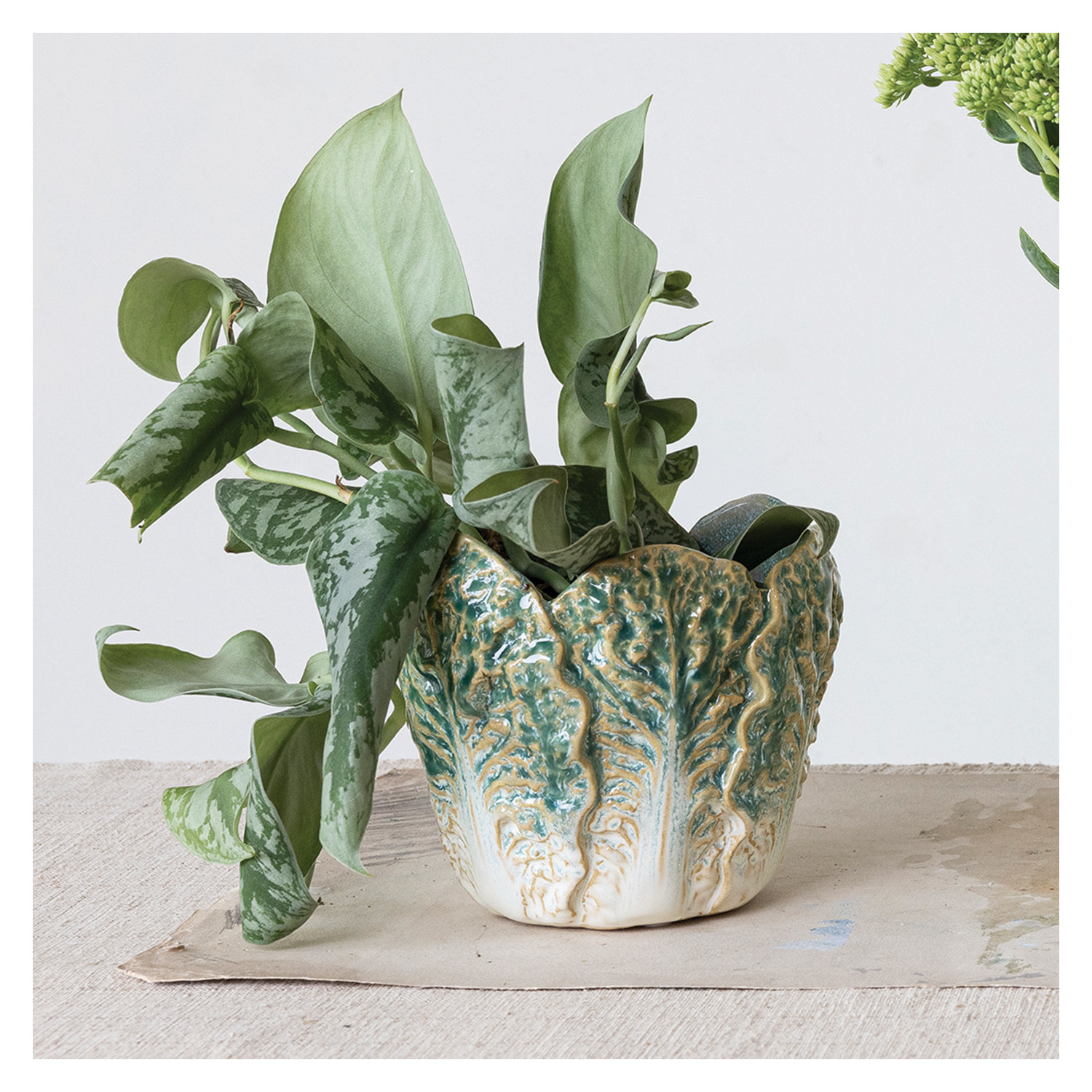 Add some charm and color to the space with this Embossed Stoneware Cabbage Planter, Reactive Glaze, Green. This adorable planter is made of high-quality stoneware that has an embossed cabbage design that creates a textured and dimensional look. The reactive glaze finish gives it a glossy and smooth surface that reflects light. The green color adds a touch of freshness and vibrancy to the planter. It has a round shape that can hold a 4-inch pot. Use it to display plants or flowers indoors or outdoors. It measures 5.75 inches in diameter and 5 inches in height, making it a perfect size for any table, shelf, or windowsill. Each planter is unique and will vary slightly in color and pattern. Whether create a farmhouse, garden, cabin, or cottagecore vibe in the space, this planter will achieve it. It is not only functional but also decorative. It will make the space stand out and impress the guests.