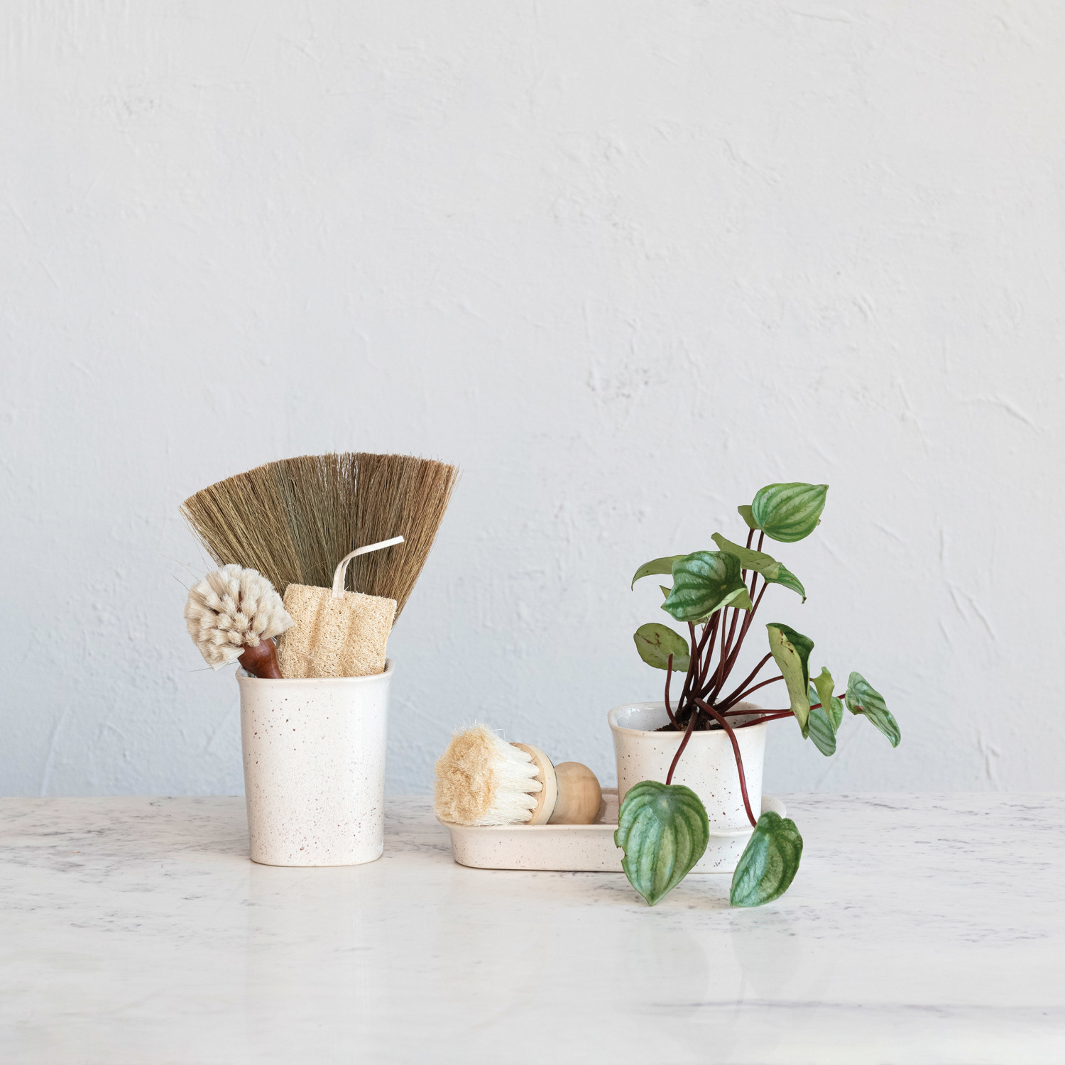 Catalog Name: 4-3/4" Square x 4"H & 5" Square x 6"H Stoneware Planters/Containers w/ 10-1/2"L x 5-1/2"W Saucer, Cream Color Speckled, Set of 3