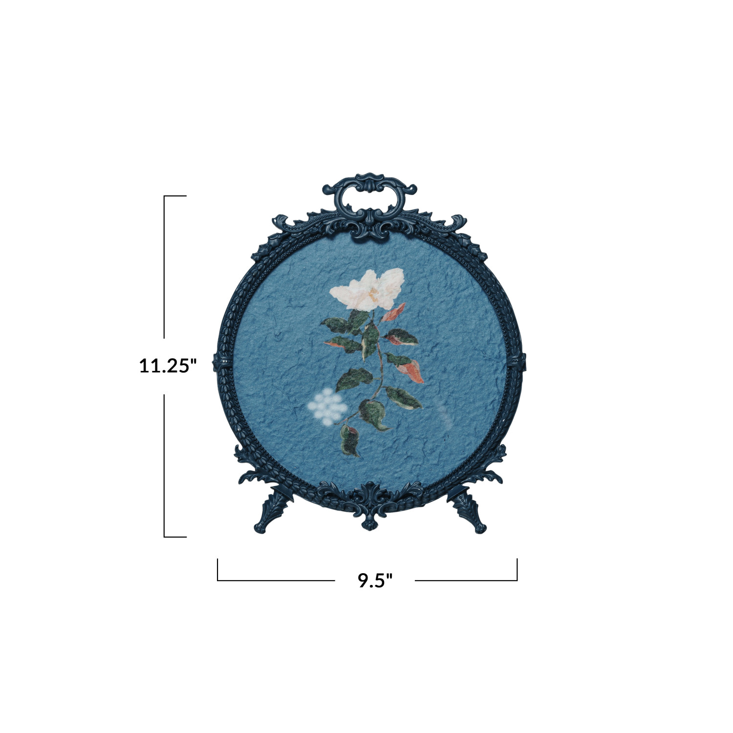 Catalog Name: 9-1/2"L x 11-1/4"H Embossed Pewter Photo Frame w/ Hand-Painted Flowers, Matte Blue (Holds 9" Round Photo)