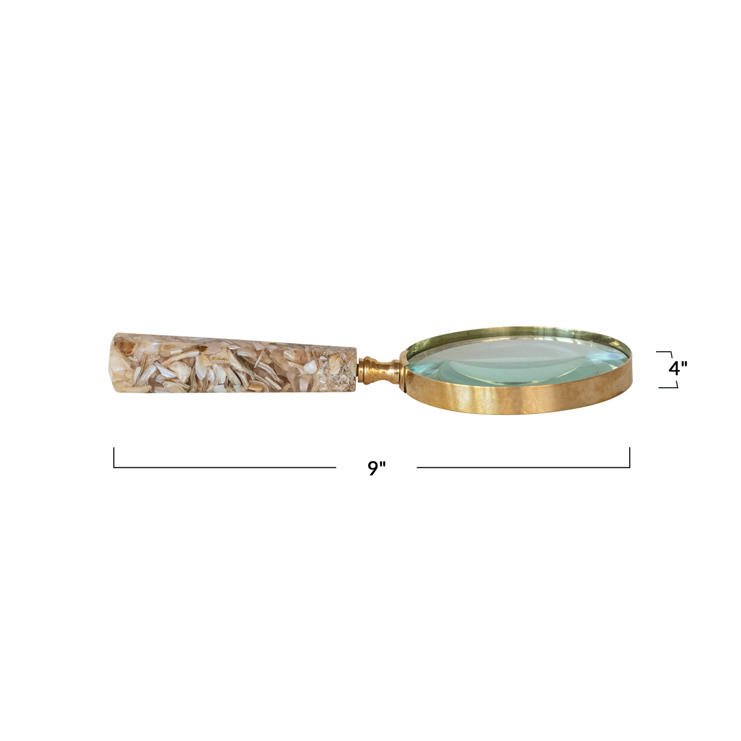Enhance the reading experience and decor with this Brass Magnifying Glass with Mother of Pearl Handle, Gold Finish. This exquisite magnifying glass features a mother of pearl handle that adds a touch of sophistication and luxury. The gold finish on the metal frame gives it an elegant and timeless appeal. It's not only functional for reading fine print or examining small objects but also serves as a beautiful decorative piece. Whether aiming for a farmhouse, French country, traditional, coastal, or transitional style, this magnifying glass will complement the space perfectly. It measures 4 inches in length, .75 inches in width, and 9 inches in height.