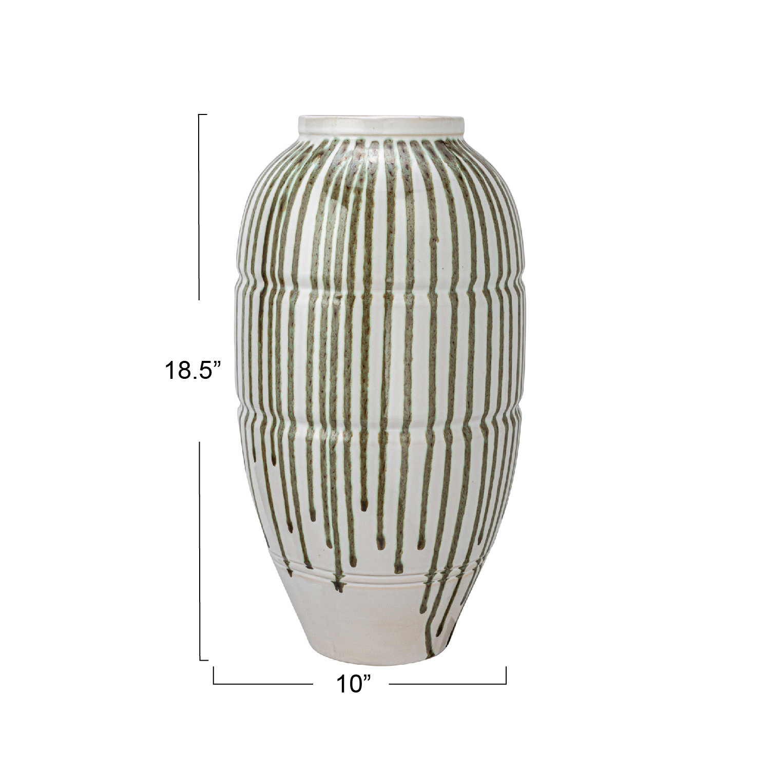 This Hand-Painted Stoneware Vase with Drip Glaze brings some beauty and charm to any space. The vase is crafted from stoneware, a material that is known for its strength and versatility. The vase features a hand-painted white and green drip glaze effect that creates a stunning contrast and visual interest. The vase has a round shape and a tall silhouette that makes it suitable for any room or surface. The vase can be used as a standalone decorative piece or filled with fresh or artificial flowers to create a lovely floral arrangement. The vase measures 10 inches in diameter and 18.5 inches in height with a 5.25-inch round opening, making it a substantial and eye-catching addition to any home décor. Whether one wants to enhance their own space or give it as a gift to someone special, this Hand-Painted Stoneware Vase with Drip Glaze is sure to impress and delight. A stunning stoneware vase that features a hand-painted white and green drip glaze effect. Ideal for adding a splash of color and texture to any contemporary, bohemian, or rustic home décor. Ideal for adding a splash of color and texture to any contemporary, bohemian, or rustic home décor. Made of stoneware.