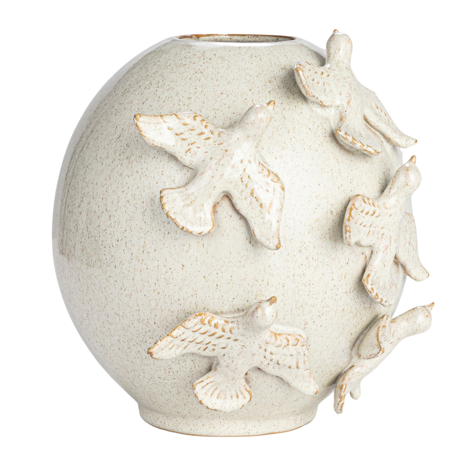 Catalog Name: 10-1/2" Round x 9-3/4"H Handmade Stoneware Vase w/ 3D Birds, Reactive Glaze, Cream Color (Each One Will Vary)