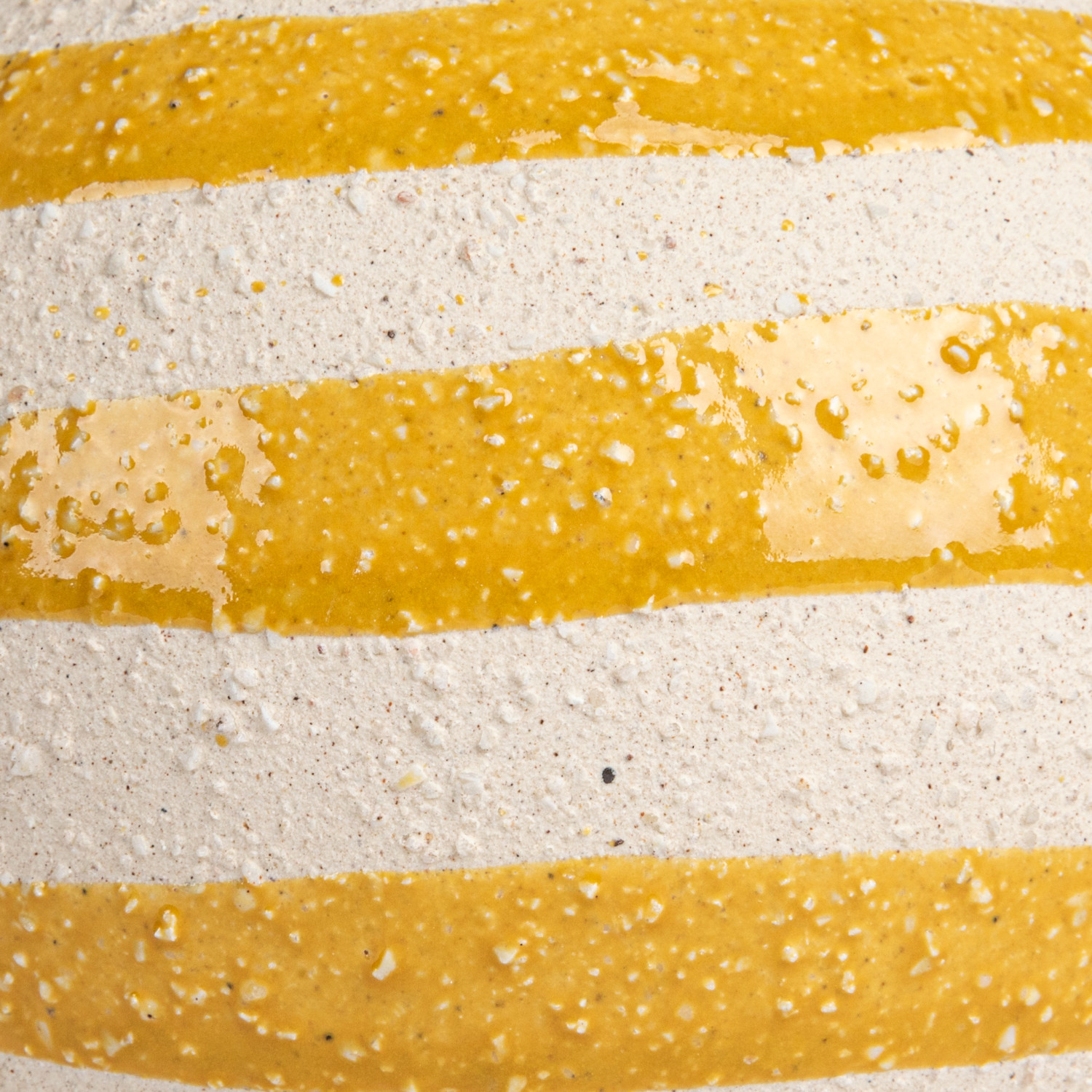 This footed sphere stoneware vase with yellow and white stripes is a charming and cozy home accessory. Made of stoneware, it has a dense, solid texture and a footed sphere shape for stability. The vase features yellow and white stripes for a cheerful and stylish look. Its reactive glaze creates a smooth, shiny surface with a unique color and pattern. This vase can hold fresh or artificial flowers, plants, or branches, or serve as a decorative accent. Place it on tables, shelves, mantels, or windowsills, and create a warm and inviting atmosphere. It is suitable for farmhouse, coastal, boho, modern, or transitional styles, adding warmth and charm to any space. The vase is a wonderful gift for those who love art and nature. Each vase will vary slightly in color and pattern due to the reactive glaze process.