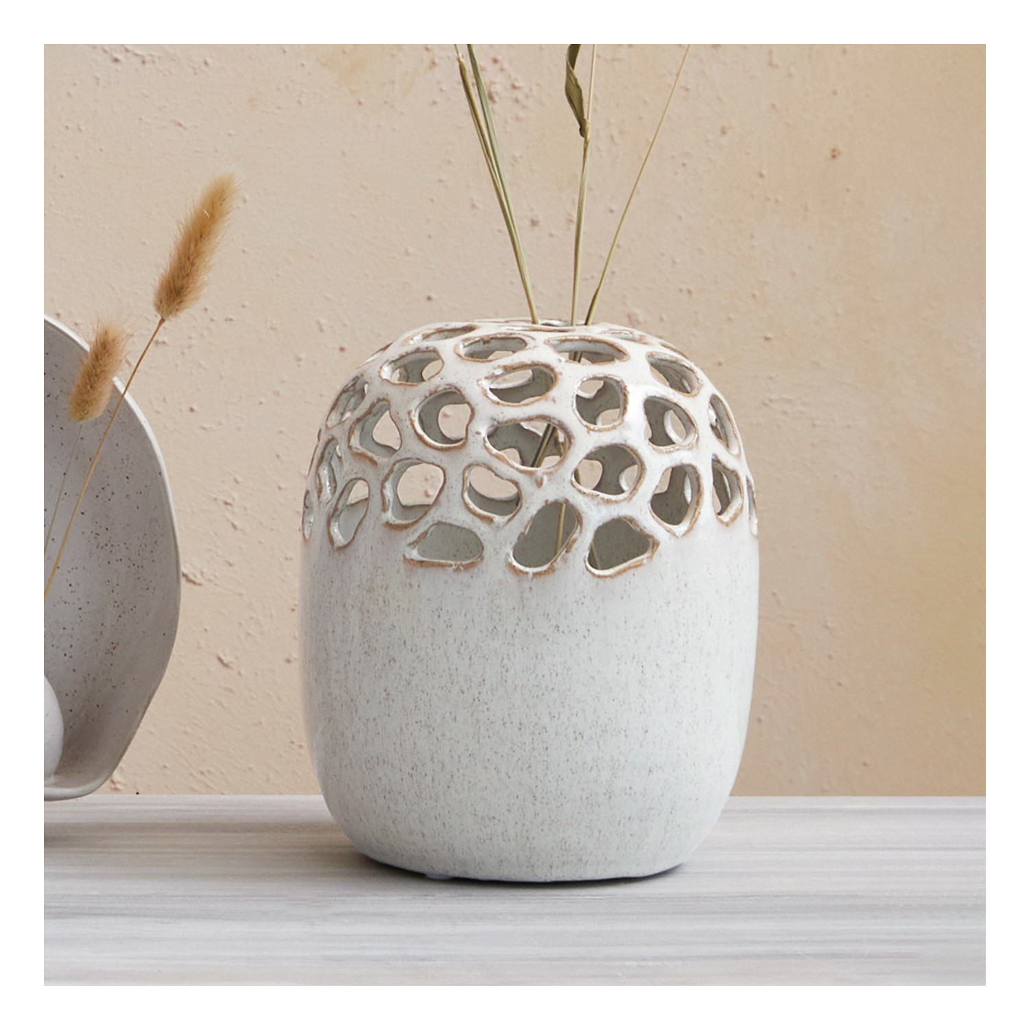 Catalog Name: 6-1/4" Round x 7-1/2"H Stoneware Vase w/ Cut-Outs, Reactive Glaze, Cream Color Speckled (Each One Will Vary)