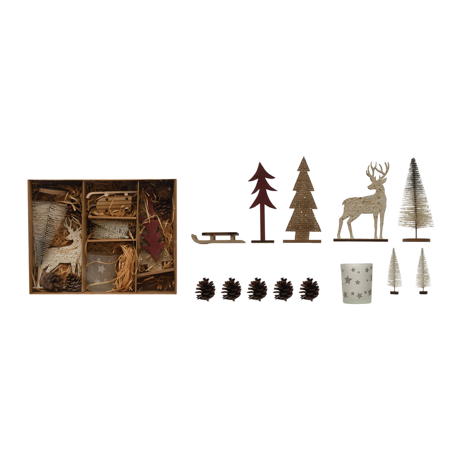 Garden Kit with Bottle Brush Trees, Tealight, Pinecones and Wood Figures, Boxed Set of 13