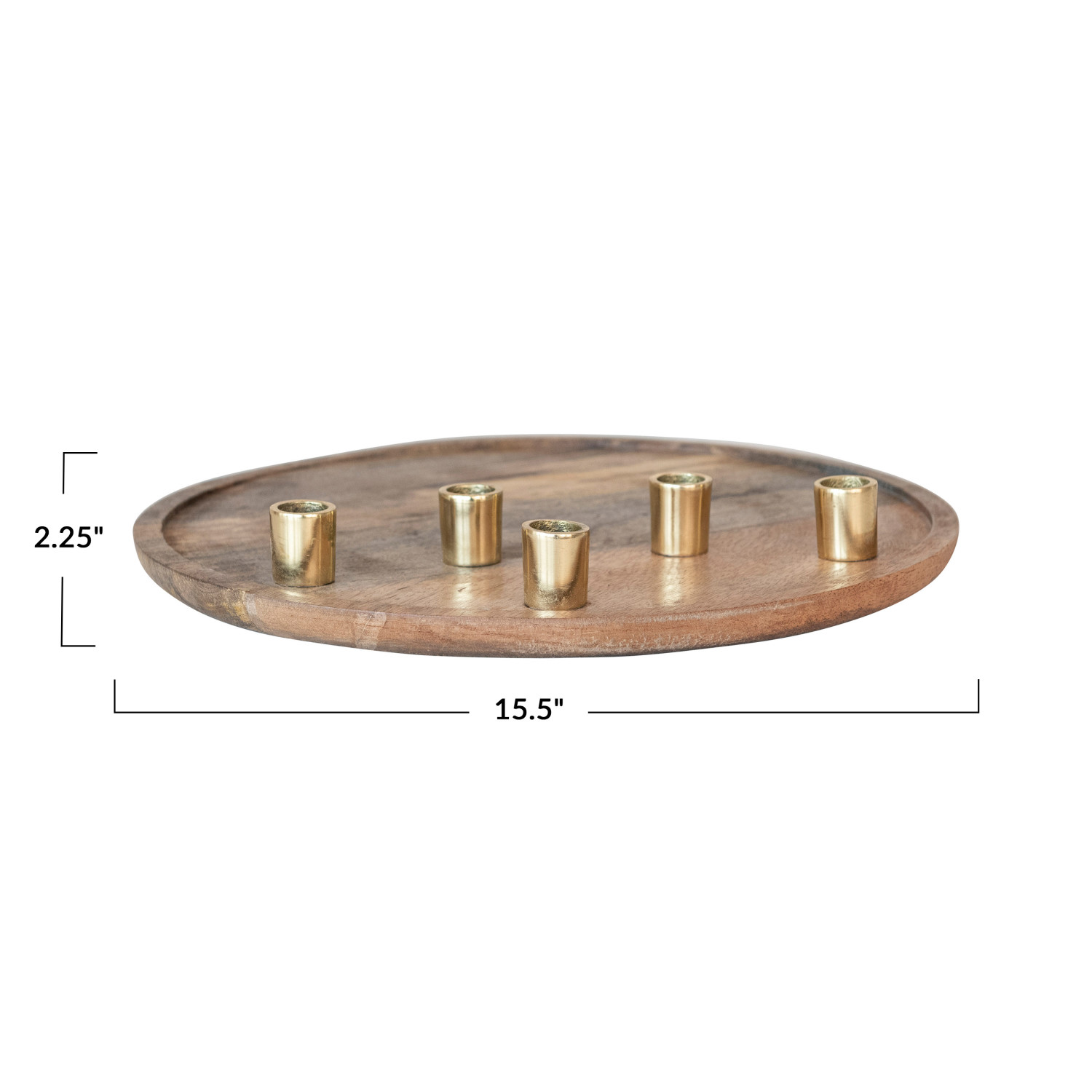 Catalog Name: 15-1/2" Round x 2-1/4"H Decorative Mango Wood & Aluminum Tray Taper Holder, Natural & Gold Finish (Holds 5 Tapers)