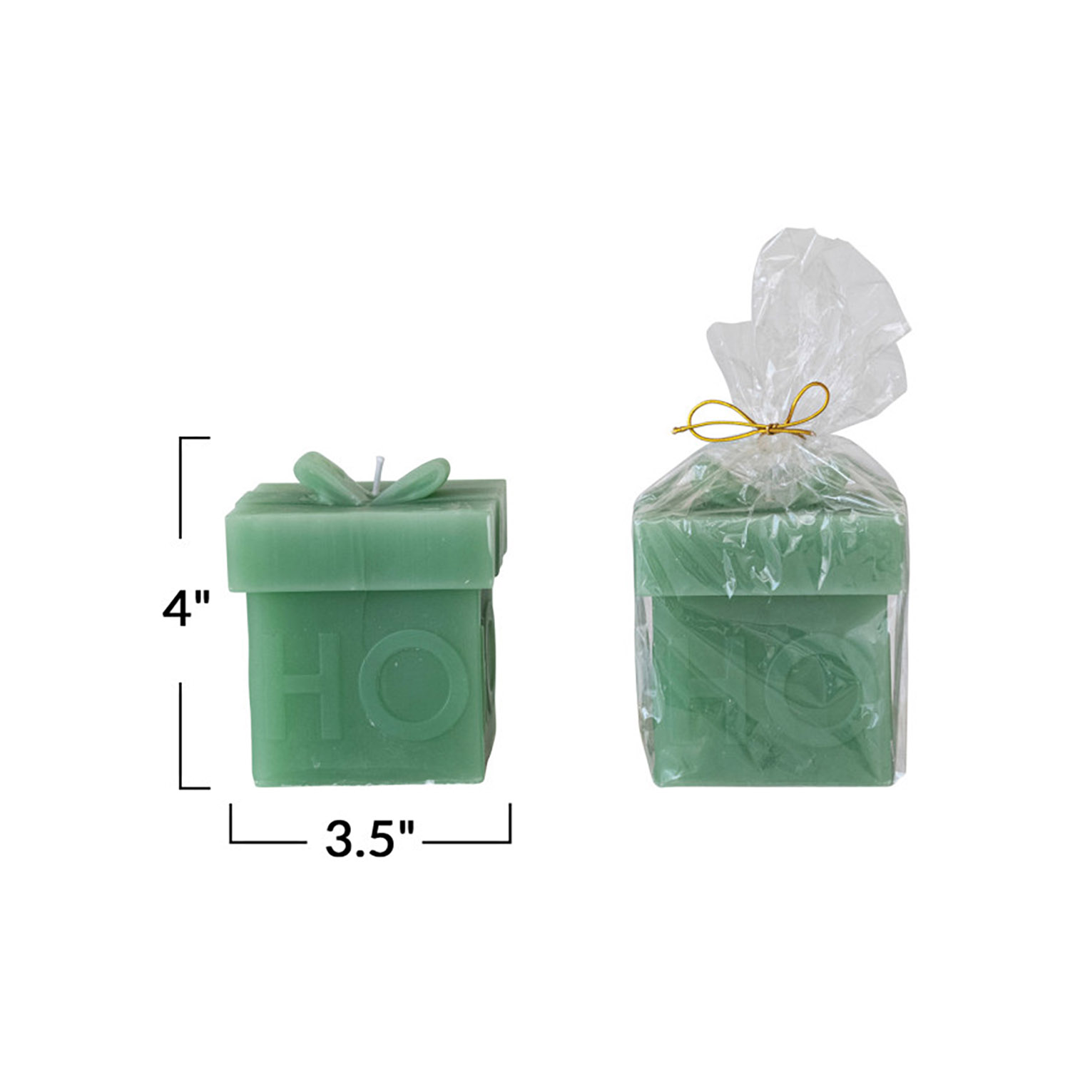 Catalog Name: 3-1/2" Square x 4"H Unscented Gift Box Shaped Candle "Ho Ho Ho", Green (Approximate Burn Time 50 Hours)