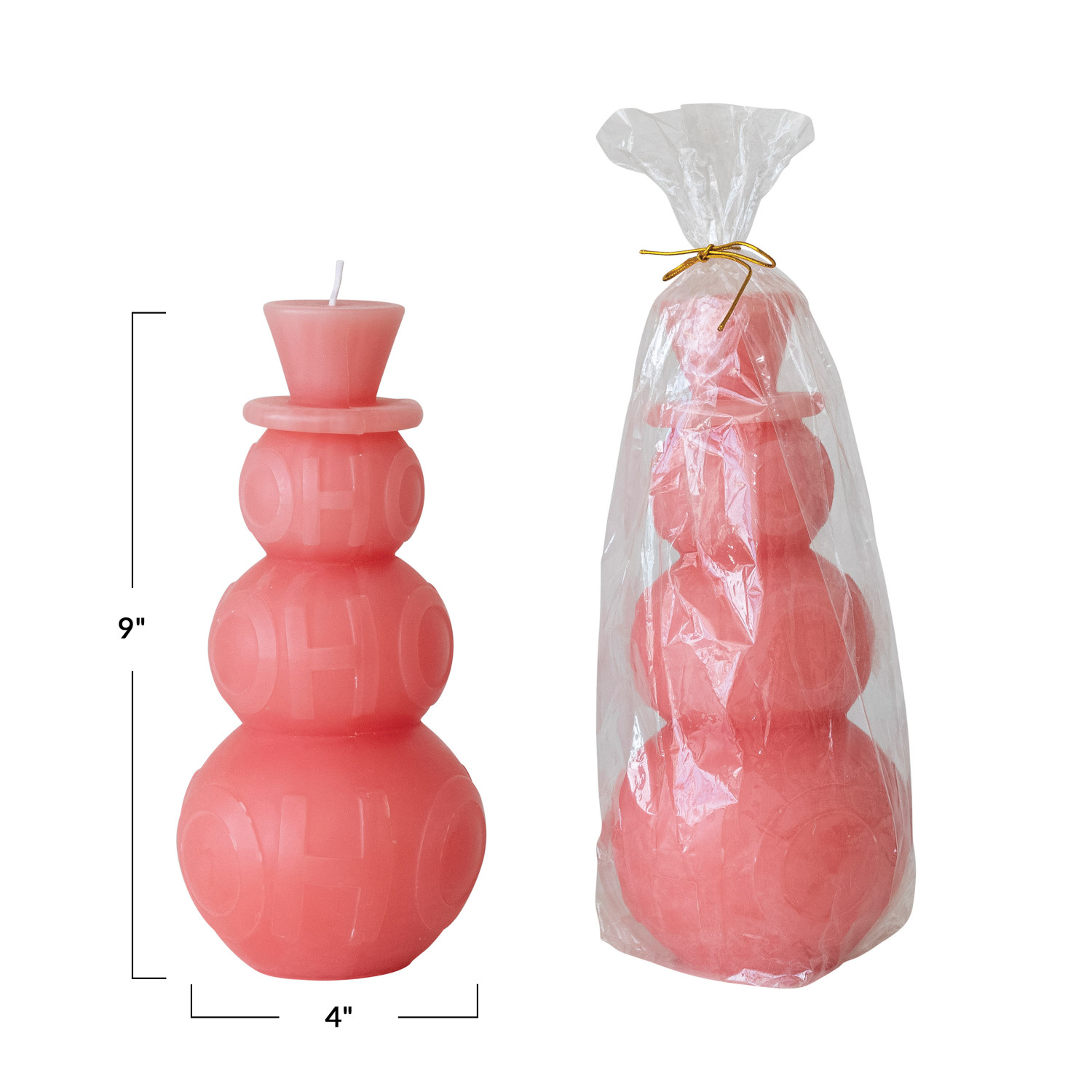 Catalog Name: 4" Round x 9"H Unscented Snowman Shaped Pillar Candle "Ho Ho Ho", Pink (Approximate Burn Time 120 Hours)
