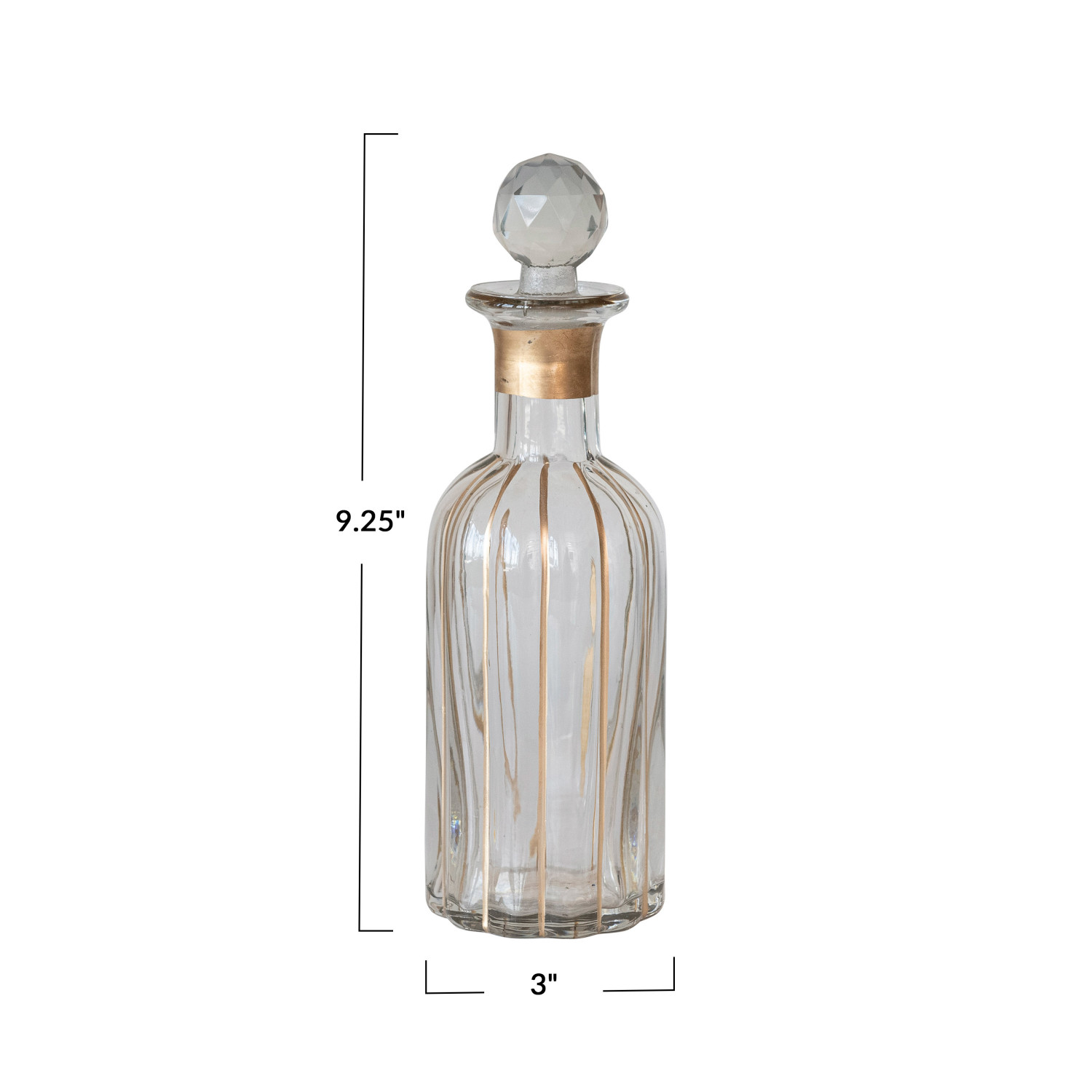 Catalog Name: 3" Round x 9-1/4"H 14 oz. Blown Glass Fluted Decanter w/ Hand-Painted Gold Finish Stripes & Stopper