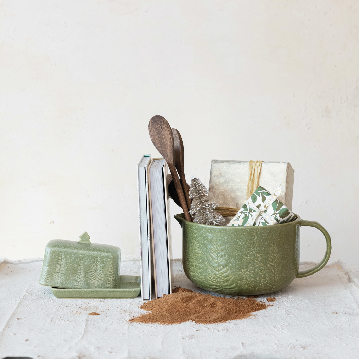 This green stoneware batter bowl with handle, trees, and matte reactive glaze is a large and lovely piece that will enhance the baking experience. The bowl features a green color that adds some contrast and elegance to any kitchen. The bowl also features a debossed design of trees that adds some flair and texture, creating a stunning and unique display. The bowl also features a matte reactive glaze that gives it a glossy and smooth surface. The bowl is made of stoneware, with a debossed design and sturdy quality. Each one will vary slightly. It is ideal for mixing and pouring batter with ease and style. The bowl is oven-safe, microwave-safe, and dishwasher-safe for easy use and cleaning. The bowl measures 12.25 inches in length, 9 inches in width, and 5.75 inches in height. Holds 4 quarts. This piece is a great way to wow or indulge anyone. A large and lovely green stoneware batter bowl with handle, trees, and matte reactive glaze. Perfect for mixing and pouring batter with ease and style. The bowl is oven-safe, microwave-safe, and dishwasher-safe for easy use and cleaning.