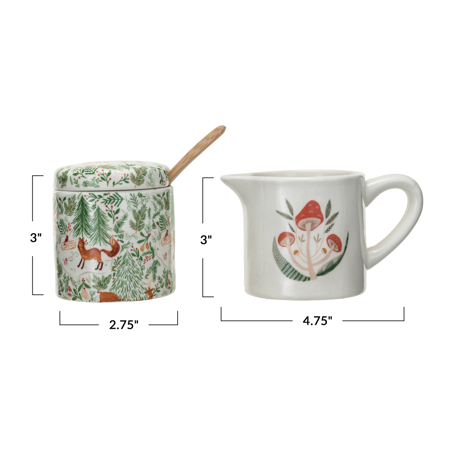 Catalog Name: 4-3/4"L x 2-3/4"W x 3"H 5 oz. Creamer & 2-3/4" Round x 3"H Sugar Pot w/ Wood Spoon & Woodland Flora/Fauna, Multi Color, Set of 3 ©
