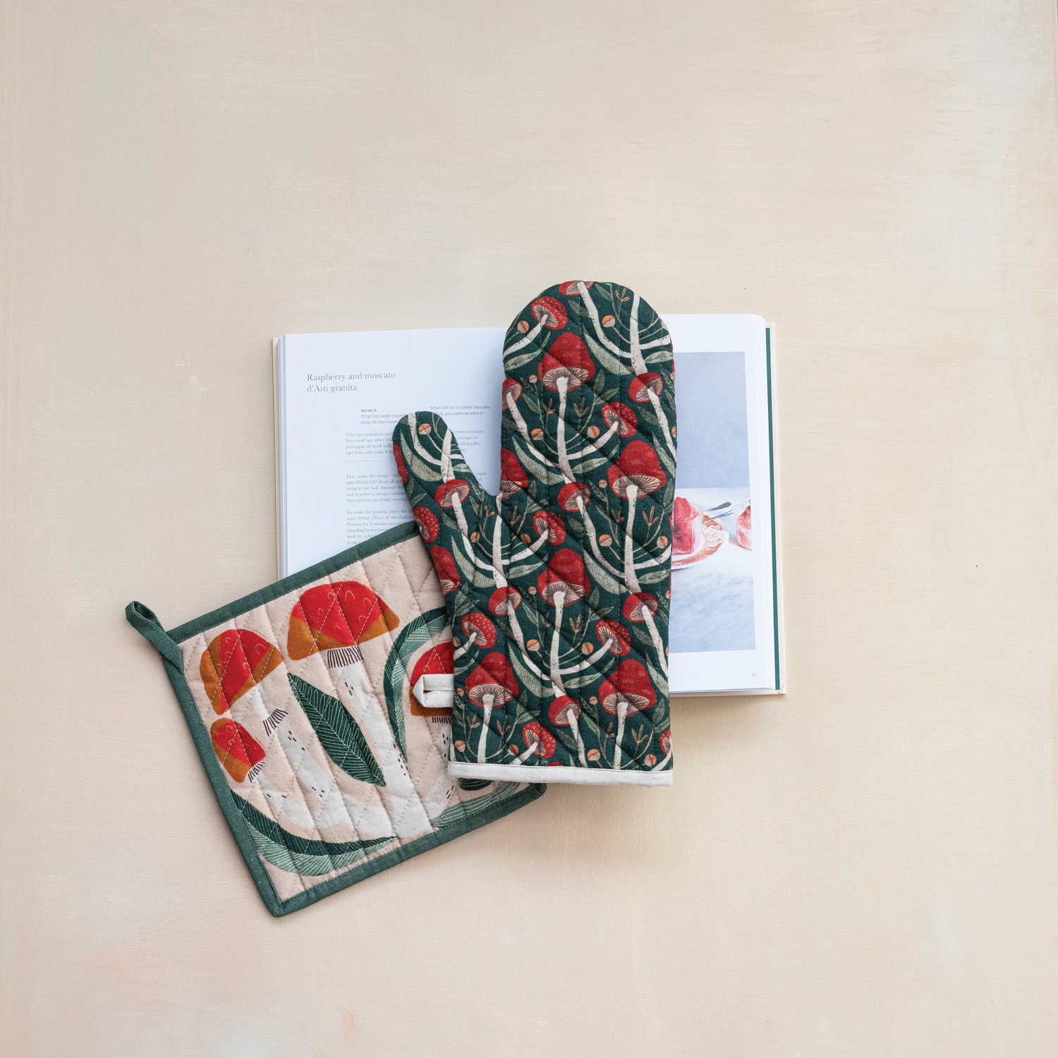 This multicolor quilted cotton oven mitt with a mushroom pattern and loop is a delightful accessory for baking and cooking needs. The oven mitt has a quilted cotton texture that gives it a cozy and comfortable feel. The oven mitt also features a colorful and cheerful mushroom pattern that adds some personality and flair to the kitchen. The oven mitt is made of high-quality cotton that is soft and breathable, making it easy to wear and use. The cotton is also machine washable and heat-resistant, ensuring durability and safety. The oven mitt has a loop at the end to hang it on a hook or a handle for easy storage and access. With this oven mitt, handle hot pots and pans with confidence and style. A cozy and cute oven mitt that has a quilted cotton texture and a fun mushrooms pattern in various colors. Perfect for adding some whimsy and charm to the kitchen or as a gift for a mushroom lover. The oven mitt has a loop at the end to hang it on a hook or a handle for easy storage and access.