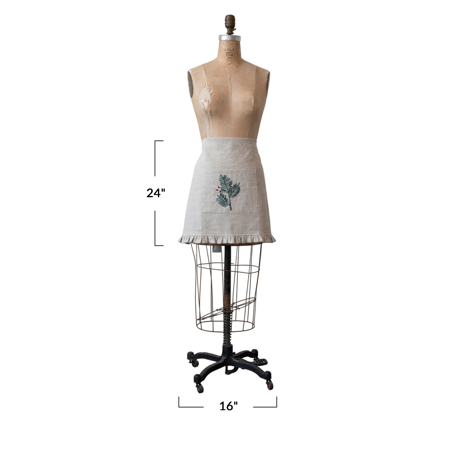 Catalog Name: 25"L x 16"W Woven Cotton & Linen Half Apron w/ Hand-Embroidered Holly, French Knots, Pocket & Ruffle, Natural, Green & Red